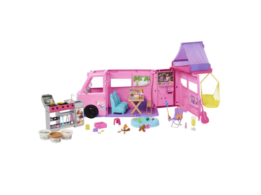 Dobrodružství volá! Herní set Barbie Karavan snů se stanem přináší sedm hracích zón a více než 60 doplňků pro spoustu zábavy pod širým nebem! Stačí karavan postrčit a vydat se vstříc. Když přijde čas na večeři, použijte přiložené "těsto" a vytvořte lahodné burgery pro Barbie a její kamarády (panenky se prodávají samostatně) nebo rozpalte gril – díky speciálnímu efektu změny barvy uvidíte, jak se jídlo „opéká“ přímo před očima! Barbie Karavan snů je ideálním dárkem pro děti od 3 let, zvlášť pro ty, které milují přírodu a dobrodružství. Panenky nejsou součástí balení. Barvy a vzhled výrobku se mohou lišit.