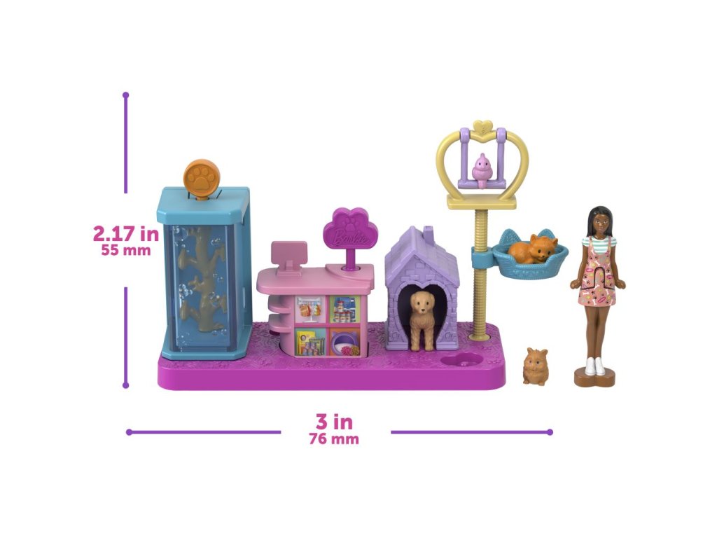Vstupte do světa panenky Barbie® s Mini BarbieLandem - místem, kde si můžete i s malou hračkou představovat velké věci! Tento mini herní set Zverimex pro domácí zvířátka je plný roztomilosti a velkých překvapení, je připraven ke hře nebo vystavení. Herní set obsahuje interaktivní hrací plochy jako jsou stojan na výrobky pro domácí mazlíčky, akvárium, domeček pro domácí mazlíčky, prostor s kočičím košíkem a miniaturní téměř 4 cm velkou panenku Barbie! Všechny panenky se ohýbají v pase a stojí na podstavci ve tvaru srdce.