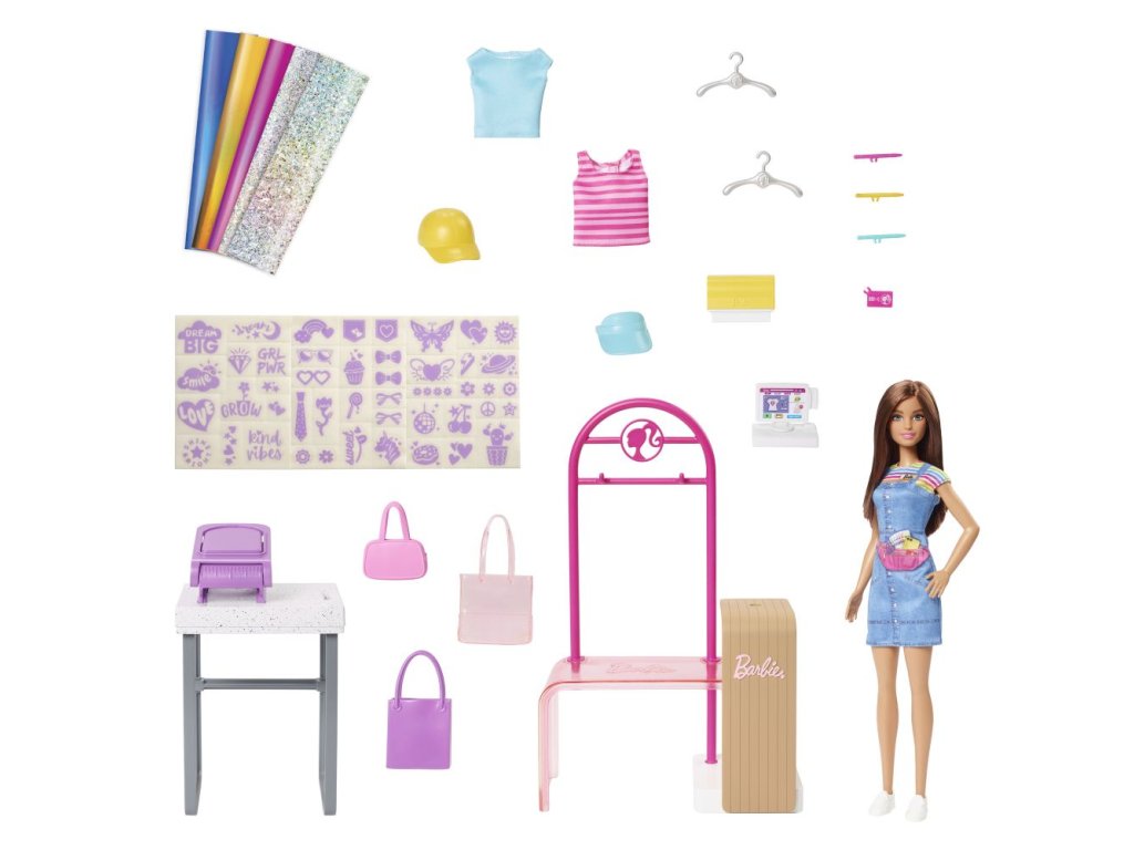 Herní set Barbie® Módní design studio s panenkou umožňuje dětem otevřít si vlastní butik s oblečky a nabízí tři způsoby hry: navrhování oblečků, vyrábění a prodej. Malí módní návrháři mohou vytvářet jedinečné oblečky pomocí funkce sítotisku na fólii a zdobit je opakovatelně použitelnými samolepkami pro více než 150 různých vzhledů. Stojánek na oblečky s ramínky je ideální na zavěšení vytvořených oblečků, jejich vystavení a zabalení k prodeji. Více než 20 tematických doplňků přispívá ke kreativní hře a vyprávění příběhů. Panenka neumí samostatně stát. Barvy a vzhled výrobku se mohou lišit.