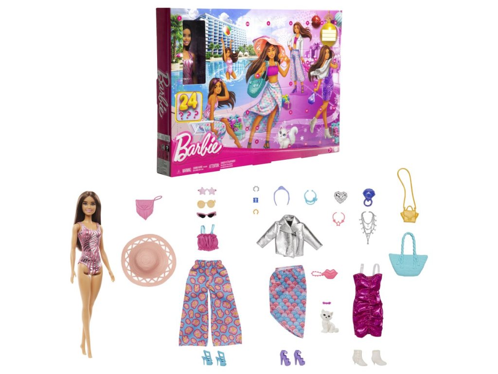 Zažijte stylovou zábavu s módním adventním kalendářem Barbie®, který skrývá 24 módních překvapení a jednu panenku Barbie®. Děti si zamilují otevírání okének s překvapením během svátečního období! Za každým okénkem najdou oblečky na denní nebo večerní nošení nebo módní doplněk! Panenka Barbie® má rovné hnědé vlasy a na sobě růžové plavky s metalickým efektem a potiskem. Mezi doplňky se skrývají sluneční brýle, peněženka, šperky, boty a dokonce i roztomilé koťátko pro větší zábavu. Barvy a provedení se mohou lišit. Panenka neumí stát samostatně. Skvěle se hodí na svátky pro děti od 3 do 7 let.