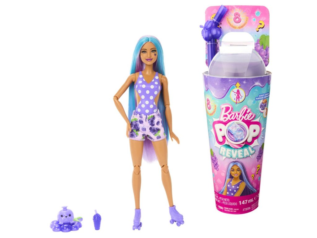Panenka Barbie® Pop Reveal™ potěší děti tematikou šťavnatého ovoce a novým zážitkem při rozbalování, kdy pomocí slizu odhalí překvapení, mezi něž patří panenka Barbie® s vůní ovoce a kostky ledu, které při prasknutí odhalí další překvapení. Set obsahuje heboučké voňavé zvířátko, tematické doplňky a hru se změnou barev. Všechny čtyři panenky z edice Pop Reveal™ Šťavnaté ovoce se liší vzhledem, druhem ovoce a barevným provedením, a i s doplňky jsou skryté v limonádových kelímcích s víčkem. Panenky se prodávají zvlášť v závislosti na dostupnosti. Panenka nemůže stát samostatně. Barvy a provedení dekorací se mohou lišit.