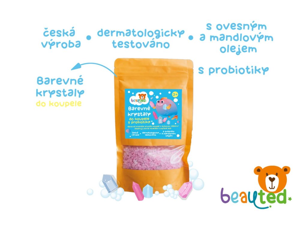 Barevné krystaly beauted šumí, barví vodu a zároveň pečují o jemnou dětskou pokožku. Obsahují probiotika podporující přirozenou ochranu pokožky. Obohaceny o minerály z mořské soli, ovesný extrakt a mandlový olej. Dermatologicky testováno – vhodné i pro citlivou dětskou pokožku. Český výrobek. Praktický uzavíratelný sáček pro snadné skladování a zachování čerstvosti. Barevné krystaly vytvoří ve vodě zábavný efekt a příjemnou vůni. Nasypte do teplé vody potřebné množství krystalů, sledujte jejich šumivý efekt a nechte se unést hravou atmosférou koupele.