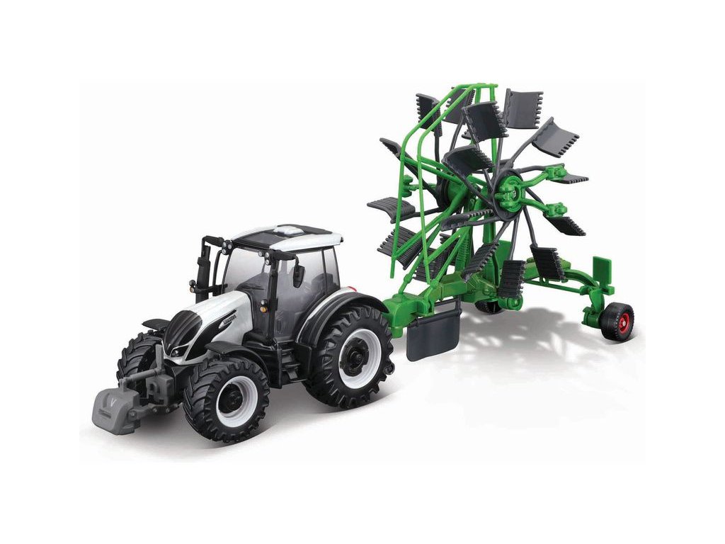 s vlečkou - BburagoKovový model traktor s vlečkou - Farm 10cm Tractor with Deluxe Trailer - Valtra N174 - Whirl Rake