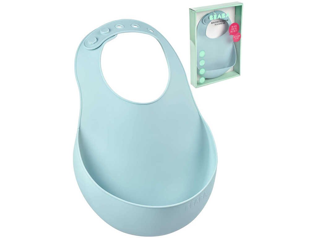 Modrozelený bryndáček z jemného, pružného silikonu je vybaven širokou kapsou pro zachycení drobečků i kapek. Dokonale ochrání oblečení dítěte již od prvních pokusů o samostatné stolování. Zapínání za krkem