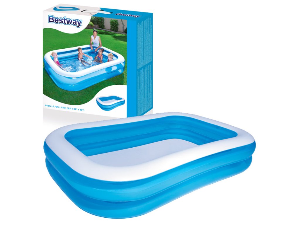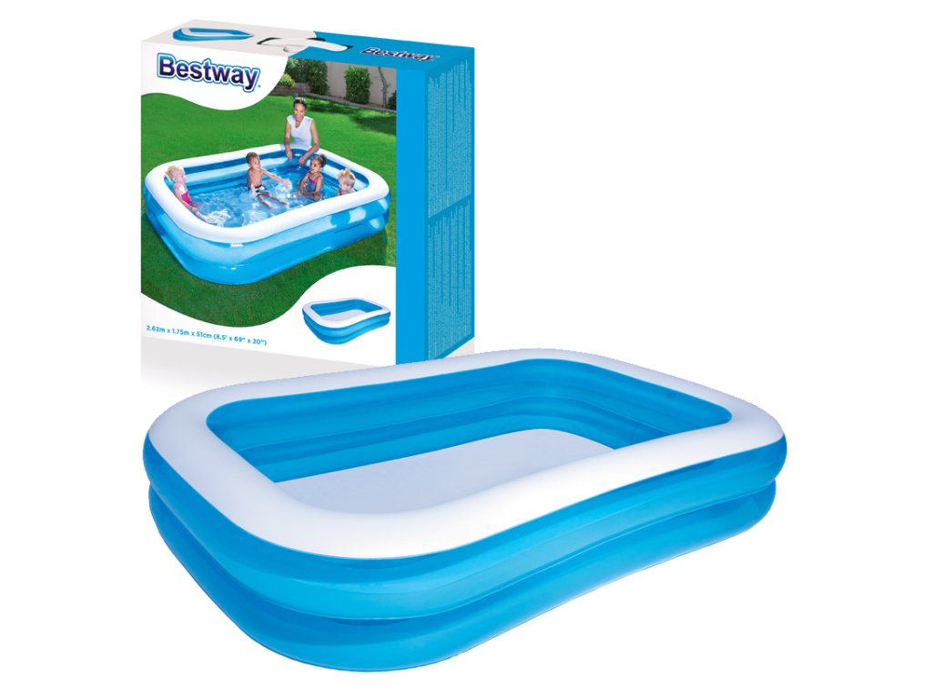 Osvěžující rodinná zábava pro horké letní dny!Užijte si nezapomenutelné chvíle s celou rodinou v tomto prostorném nafukovacím bazénu Bestway® Family Pool v zářivě modré barvě! Tento obdélníkový bazén je ideální volbou pro všechny, kteří hledají kvalitní a cenově dostupné řešení pro letní osvěžení přímo na zahradě. Klíčové vlastnosti: Velkorysé rozměry: 262 × 175 × 51 cm - dostatek prostoru pro celou rodinuImpozantní kapacita: 778 litrů vody pro maximální zábavuOdolný materiál: vyrobeno z kvalitního a odolného PVCExtra široké stěny: zajišťují stabilitu a bezpečnost při hraníVzorované vnější stěny: dodávají bazénu atraktivní vzhled Konstrukce a vybavení: 2 stejně velké vzduchové komory - pro rovnoměrné nafouknutíRychlouzavírací ventily - snadné a rychlé nafouknutíVýpustný ventil - pohodlné vypuštění vody po použitíStrukturovaný design stěn - kombinace stability a estetikyVčetně opravné sady - pro případ drobného poškození Jednoduché používání: Rychlá instalace - bazén nafoukněte během několika minutNaplňte vodou - a zábava může začít!Po použití jednoduše vypusťte vodu výpustným ventilemVyfoukněte vzduch a bazén složte pro úsporné skladování Ideální pro: Rodiny s dětmi od 6 letZahrady všech velikostí - kompaktní rozměryHorké letní dny - okamžité osvěženíSpolečné rodinné aktivity - podpora společně stráveného času Technické údaje: Rozměry nafouknuté: 262 × 175 × 51 cmRozměry nenafouknuté: 248 × 163 cmKapacita vody: 778 litrůDoporučený věk: 6+Materiál: odolné PVCBalení: barevná krabice Obsah balení: 1× nafukovací bazén Bestway Family Pool1× sada opravných záplat Bezpečnostní upozornění: Používejte pouze pod dohledem dospělých. Není určeno pro děti mladší 6 let.Dopřejte své rodině osvěžující letní zábavu s tímto kvalitním nafukovacím bazénem Bestway! Ideální volba pro všechny, kteří hledají cenově dostupné řešení pro horké dny.