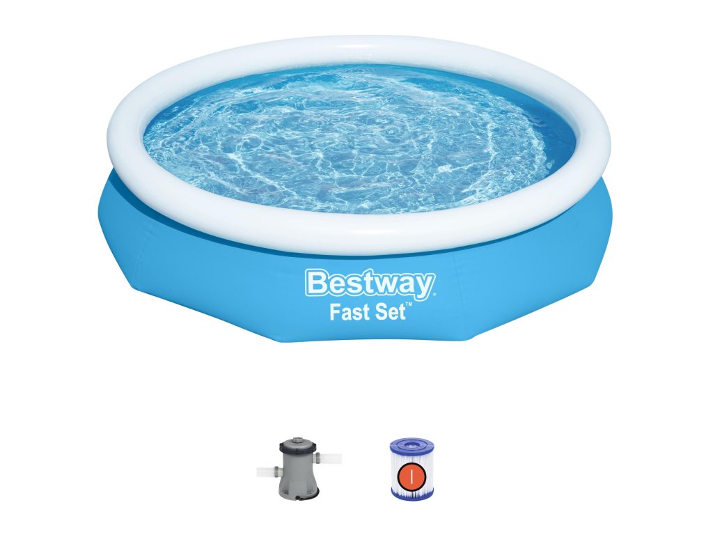 Bestway nadzemní kruhový bazén Fast Set je skvělý rodinný bazén, který sestavíte během několika minut. Stačí rovná plocha, nafouknout vrchní kruh. Tělo bazénu se zvedne, jakmile bazén naplníte vodou. Sada obsahuje filtrační čerpadlo a filtrační vložku, která udržuje vodu čerstvou a čistou. Dodává se také s vypouštěcím ventilem pro regulaci průtoku, který umožňuje rychlé vypuštění na konci sezóny. Extra silné boční stěny tohoto bazénu jsou vyrobeny z materiálu Tritech , 3-vrstvového vyztuženého materiálu s jádrem z polyesterové sítě uzavřeného mezi dvěma vrstvami PVC materiálu s vysokou rozchodností. To vytváří celkovou tloušťku 0,40-0,80 mm (rozměr 16-32) v závislosti na velikosti bazénu a nabízí vynikající pevnost a trvanlivost, takže bazén využijete i v dalších letech. Rozměr: 305 x 66 cm. Vodní kapacita: 3200 l (80%). Obsahuje: 1 bazén, 1 filtrační čerpadlo (220-240 V) s kompatibilní kazetou 58093, 1 záplata na opravu pod hladinou vody.