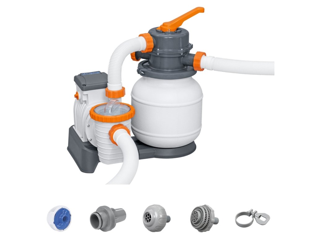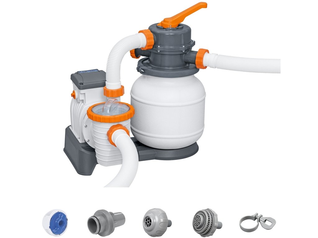 Filtrační zařízení se skládá z plastové podstavy, polypropylenové filtrační nádoby o průměru 254 mm s vrchním 6-ti cestným ventilem integrovaným do víka nádoby, manometru a čerpadla s vlasovým předfiltrem. Filtrační nádoba je propojena s čerpadlem flexibilní hadicí. Tato filtrace je vhodná zejména pro nadzemní bazény Bestway. Množství písku ve filtrační nádobě je cca 9kg. Písková náplň (9kg) není součástí dodávky!!! Písková filtrace dodávána v šedivé barvě. Technické údaje: napětí 220–240 V stupeň krytí IP X4 příkon 230 W maximální průtok 5678 litrů/hod maximální provozní tlak 0,83Bar průměr filtrační nádoby 254 mm maximální teplota vody 35°C potřebné množství písku cca 9 kg