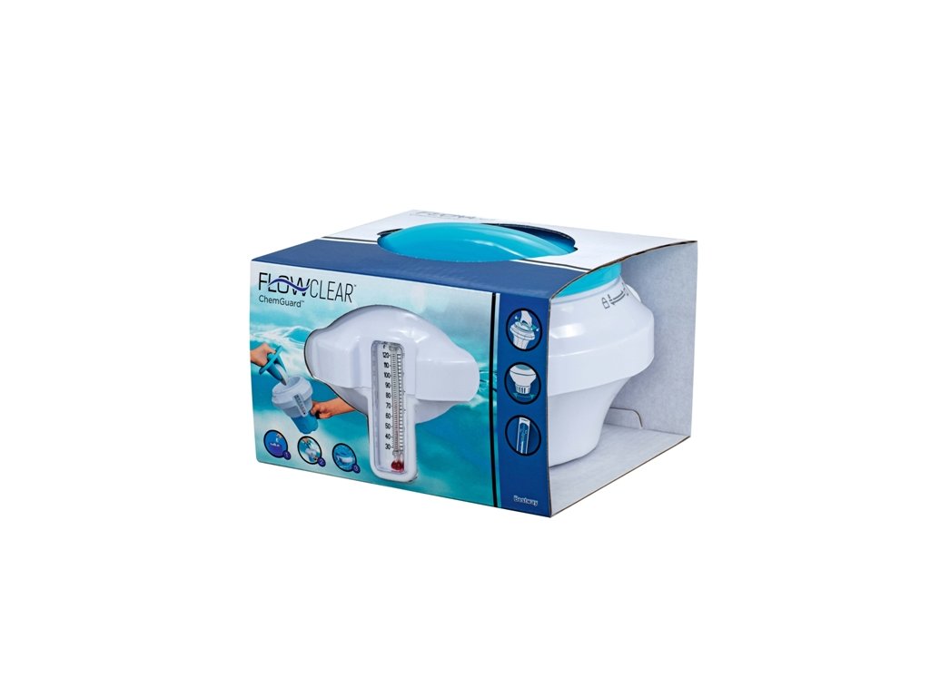 Kontakt kůže s chemikáliemi může způsobit podráždění a vyblednutí pokožky. Ochranná rukavice ChemGuard™ ve víku účinně zabraňuje kontaktu s chemikáliemi. Dětská pojistka zabraňuje malým ručkám bez dalšího otevřít dávkovací plovák. Nabízí prostor pro až Ø 7,6 cm velké chlórové nebo bromové tablety (nejsou součástí dodávky) a zajišťuje rovnoměrné rozložení bazénové chemie při plavání. Nastavitelný dávkovací otvor umožňuje přizpůsobit uvolňování chemikálií velikosti vašeho bazénu, takže vždy dostanete správné množství. Dávkovací plovák má také integrovaný teploměr, takže můžete číst zobrazení teploty ve stupních Celsia i Fahrenheita. Udržování bazénu v čistotě nebylo nikdy tak bezpečné a snadné. Detaily produktu Rozměr: Ø 17,5 x 18,6 cm Rovnoměrné rozložení až 3" bromových a chlórových tablet (nejsou součástí dodávky) Víko s integrovanou rukavicí + dětská pojistka Vícedílná konstrukce usnadňuje skladování Vestavěný snadno čitelný teploměr ve stupních Fahrenheita a Celsia Nastavitelný dávkovací otvor Upozornění: Děti by měly zůstat v bazénu nebo v bazénu pouze pod dohledem dospělé osoby! Chemikálie musí být uchovávány mimo dosah dětí!