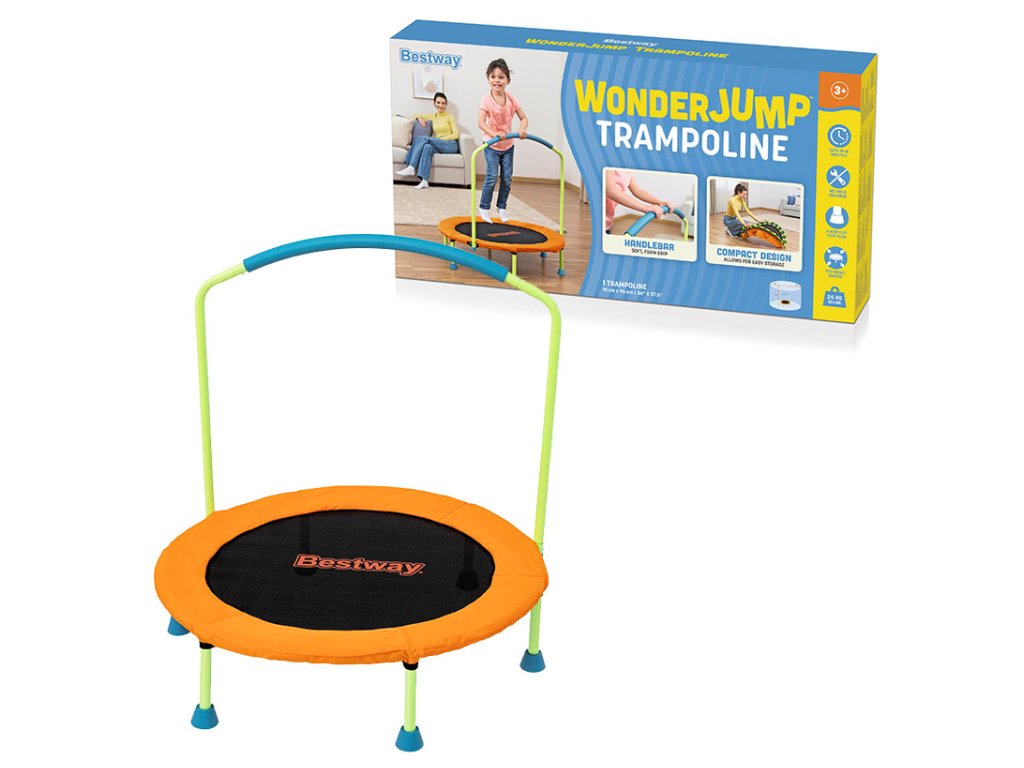 Bestway® Wonderjump™ je ideální trampolína pro domácí použití, která poskytuje dětem skvělou možnost aktivního pohybu a zábavy. Technické parametry: Průměr: 91 cm Výška: 96 cm Antikorozní práškově lakovaný ocelový rám Odnímatelné madlo s pěnovým potahem Protiskluzové nožičky Hlavní výhody: Snadná montáž bez nářadí Stabilní a bezpečná konstrukce Skladné provedení - možnost složení Vhodná pro vnitřní použití Minimální prostorové nároky Praktické vlastnosti: Odnímatelné madlo pro větší bezpečnost Protiskluzová úprava nohou Kompaktní design pro snadné skladování Robustní konstrukce pro dlouhou životnost Bezpečnostní upozornění: ⚠️ Vhodné pro děti od 3 let ⚠️ Nutný dohled dospělé osoby během používání ⚠️ Umístěte na rovný povrch bez překážek ⚠️ Na trampolíně může skákat pouze jedno dítě současně ⚠️ Pro větší stabilitu doporučujeme používat madlo Dodáváno v barevné krabici.