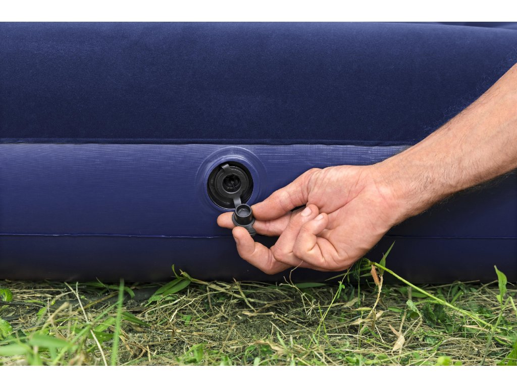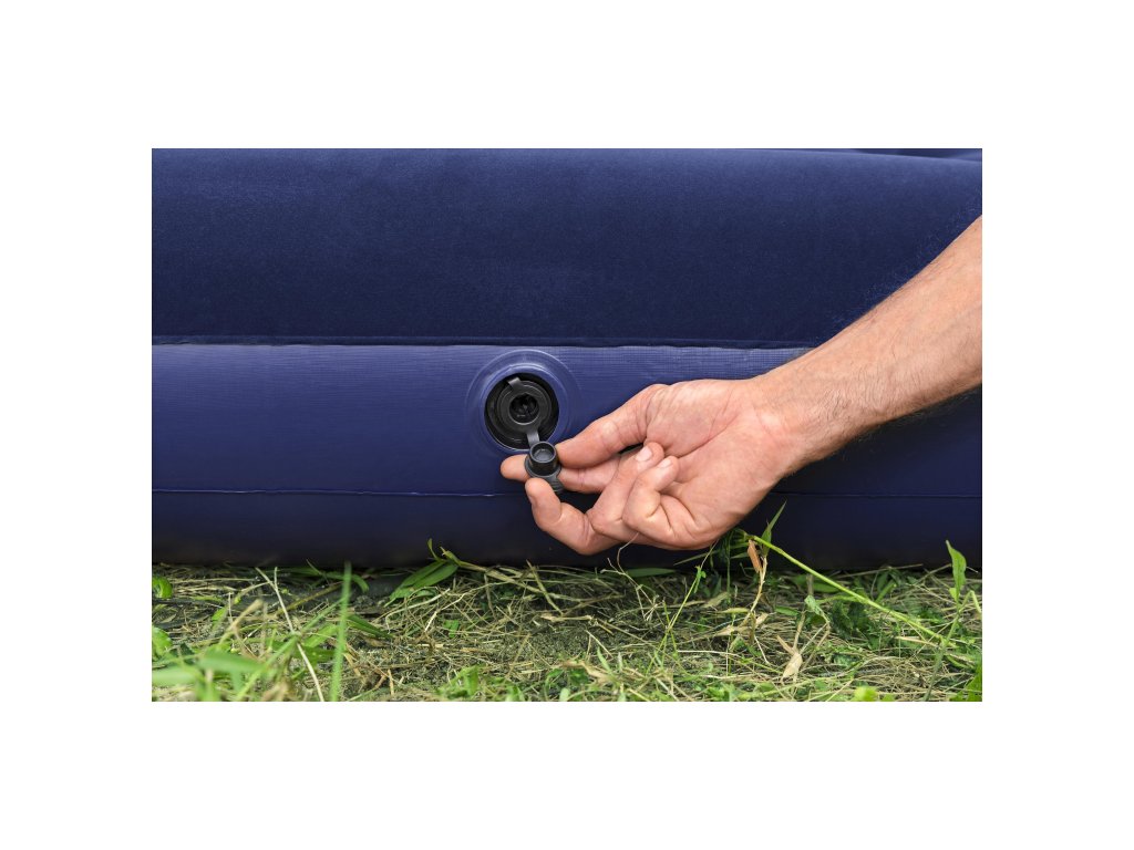 Pohodlná nafukovací postel s integrovanou nožní pumpou, vhodná pro vnitřní i venkovní použití. Ideální pro camping nebo jako přistýlka pro hosty. Technické parametry: Rozměry nafouknutého: 188 x 99 x 28 cm Výška bez polštáře: 22 cm Maximální nosnost: 150 kg Pro 1 osobu Materiál: odolný vinyl Konstrukce: Robustní Coil-Beam konstrukce Sametový povrch Integrovaný nafukovací polštář 2-cestný rychlouzávěr ventilu GS certifikovaná nožní pumpa (SGS-TÜV Saar) Výhody: Snadné nafukování pomocí nožní pumpy Nevyžaduje elektrické připojení Rychlé vypouštění Pohodlná sametová plocha na spaní Stabilní konstrukce Kompaktní při skladování Použití: Camping Přistýlka pro hosty Vnitřní i venkovní využití Bezpečnostní upozornění: ⚠️ Nepoužívejte v blízkosti otevřeného ohně ⚠️ Není určeno pro použití ve vodě ⚠️ Nepřekračujte maximální nosnost Součástí balení je opravná záplata.