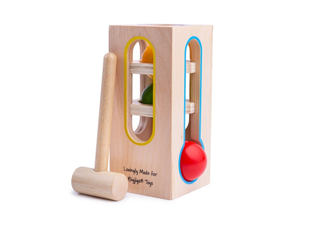Tato jednoduchá dřevěná hračka slibuje hodiny zábavy při zatloukání. Každý barevný míček je sražen dolů do spodní části věže, po umístění zpět nahoru můžete začít zatloukat znovu! Práce s kladivem a manipulace s kuličkou pomůže s rozvojem jemné motoriky, koordinace ruka-oko a rozpoznáváním barev. Vyrobeno z kvalitních materiálů ze zodpovědných zdrojů. Vyhovuje současným evropským bezpečnostním normám. Hlavní vlastnosti: skládá se ze 4 částírozvíjí jemnou motoriku a koordinaci ruka-okopomáhá učit rozpoznávání barev
