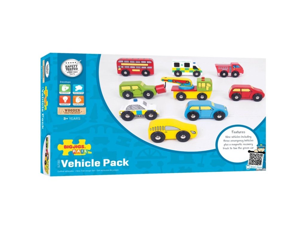 9 autíček. Součástí balení je vše dle obrázku. Hlavní vlastnosti: Vláčkodráhy a jejich příslušenství značky Bigjigs Rail je možno kombinovat se všemi dalšími dřevěnými vláčkodráhami na trhu.Vyrobeno z kvalitních a zodpovědně získaných přírodních materiálů.Odpovídá současným evropským bezpečnostním normám.Podporuje představivost, obratnost a koordinaci.