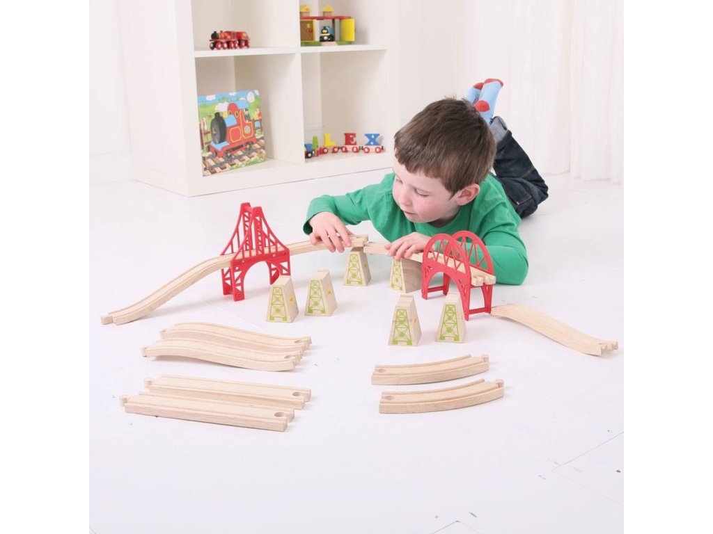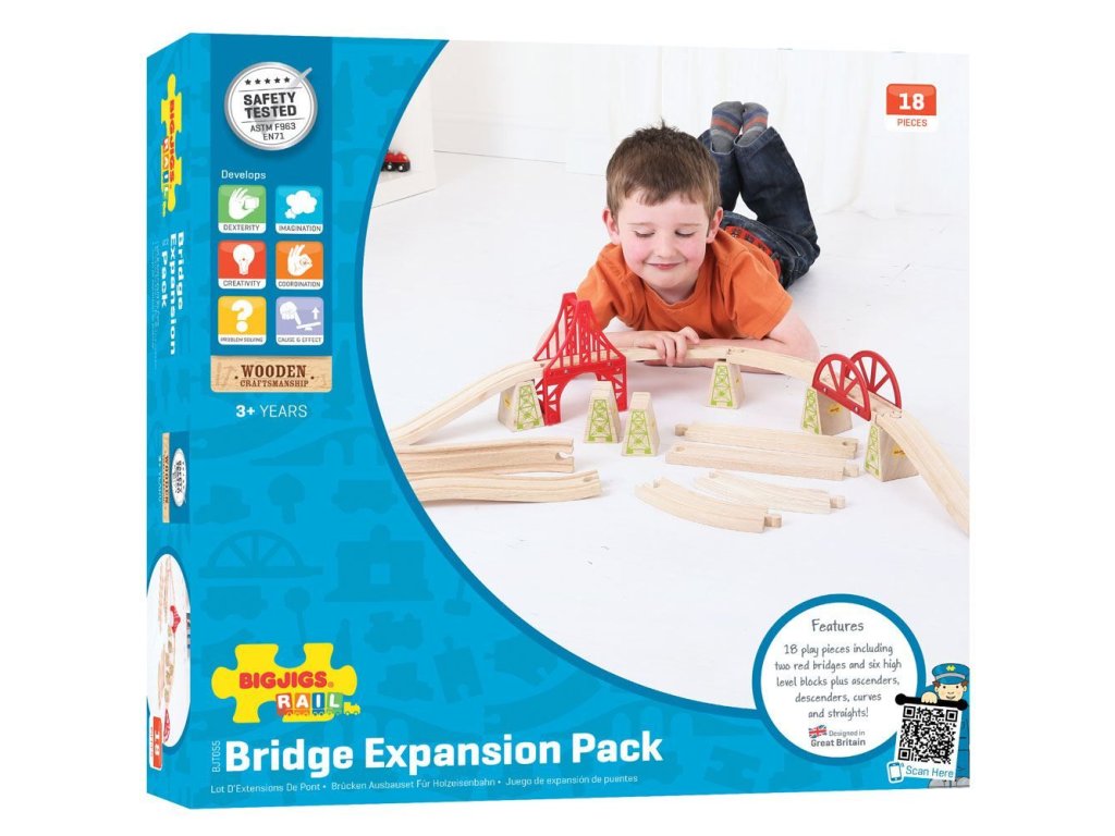 Tato rozšiřující sada mostů, podpůrných bloků, stoupajících a klesajících kolejnic a dalších kolejnic, umožní Vaším vlakům přejíždět přes různé otvory, překážky a nerovnosti. Hlavní vlastnosti: vláčkodráhy a jejich příslušenství značky Bigjigs Rail je možno kombinovat se všemi dalšími dřevěnými vláčkodráhami na trhuvyrobeno z kvalitních a zodpovědně získaných přírodních materiálůodpovídá současným evropským bezpečnostním normámpodporuje představivost, obratnost a koordinaci