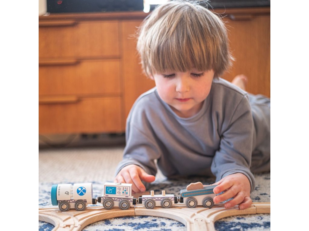 Čtyři magnetické vláčky se snadno připojí k sobě a jsou připraveny vyjet během několika sekund. Tato dřevěná souprava vlaků je dodávána se dvěma kusy kolejí a nárazníkem v případě nouzového zastavení. Hlavní vlastnosti: Vláčkodráhy a jejich příslušenství značky Bigjigs Rail je možno kombinovat se všemi dalšími dřevěnými vláčkodráhami na trhu.Vyrobeno z kvalitních a zodpovědně získaných přírodních materiálů.Odpovídá současným evropským bezpečnostním normám.Podporuje představivost, obratnost a koordinaci.