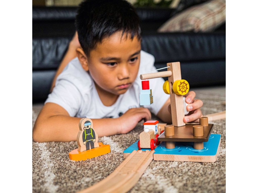 Zpestřete svou vláčkodráhu malým dokem s funkčním jeřábem, který je pro snadnou manipulaci s nákladem vybaven magnetem a jehož pomocí mohou děti cvičit svou zručnost. K záchraně nákladu, který spadl do vody je zde vždy připraven potápěč ve svém člunu. Rozšíření přináší možnost rozehrát fantastické herní scénáře a je zvláště vhodné k doplnění soupravy Úklid pobřeží. Vyrobeno z vysoce kvalitních, odpovědně získaných materiálů ošetřených nezávadnými barvami a laky. Hlavní vlastnosti:dok s jeřábem, člun a figurka potápěčeplně funkční jeřáb opatřený magnetemrobustní, odolné a atraktivní zpracováníkompatibilní s vláčkodráhami dalších výrobců