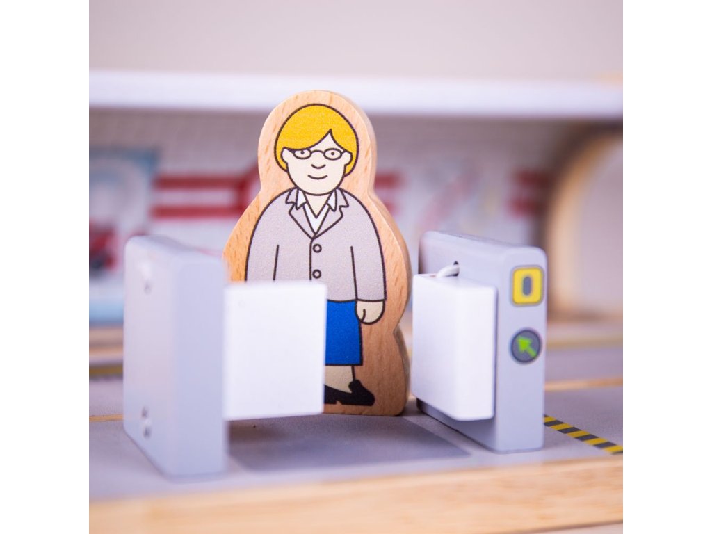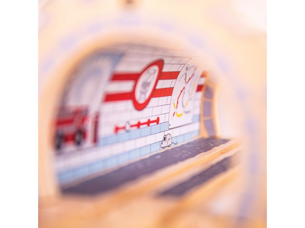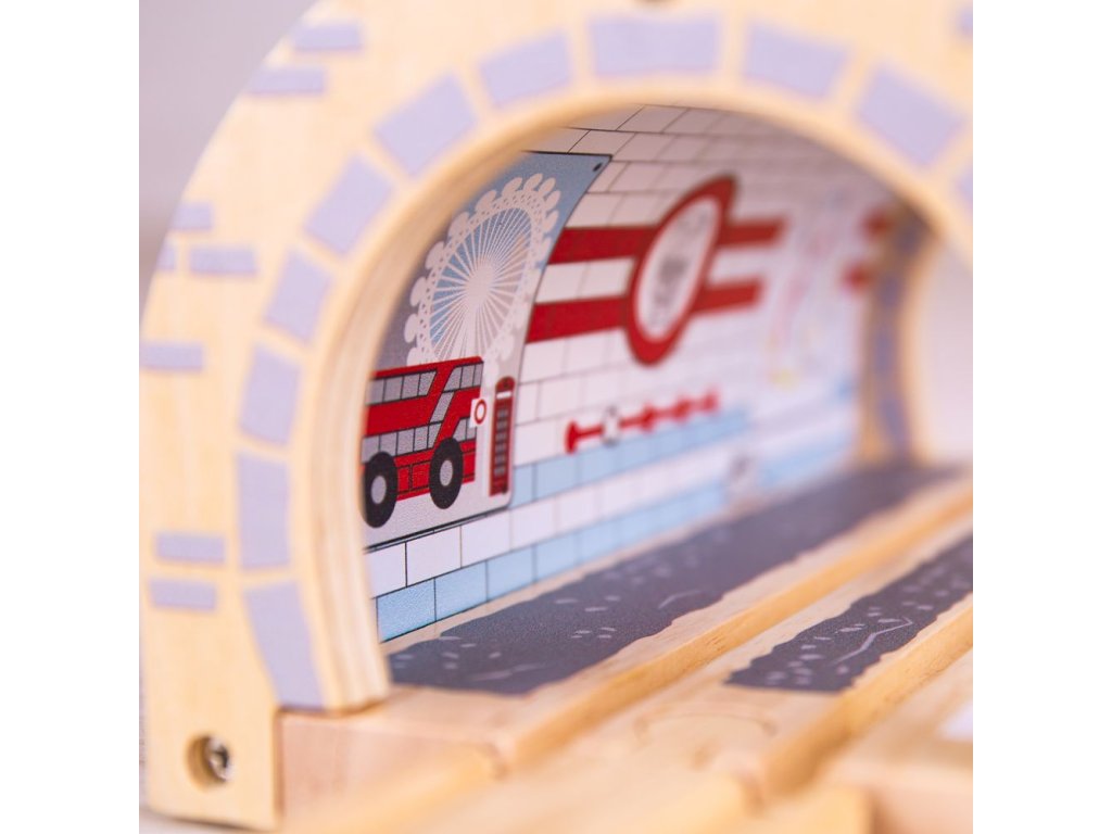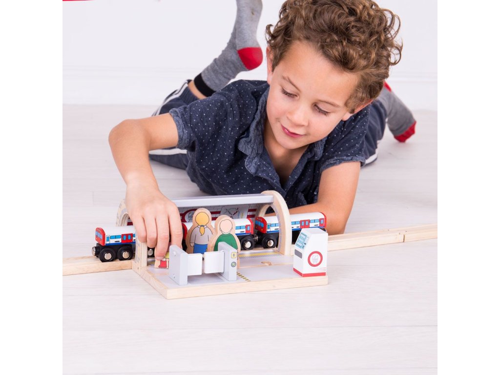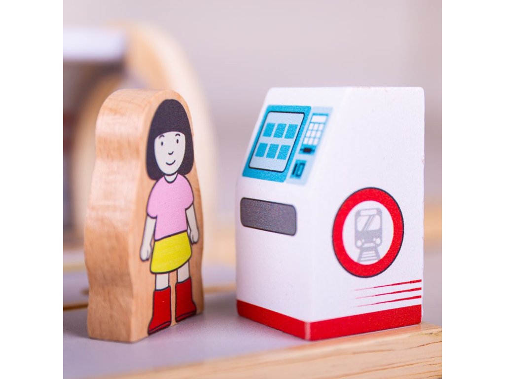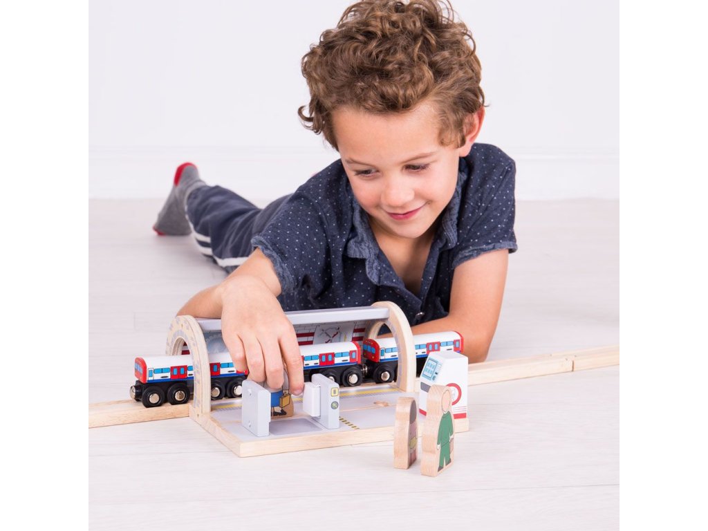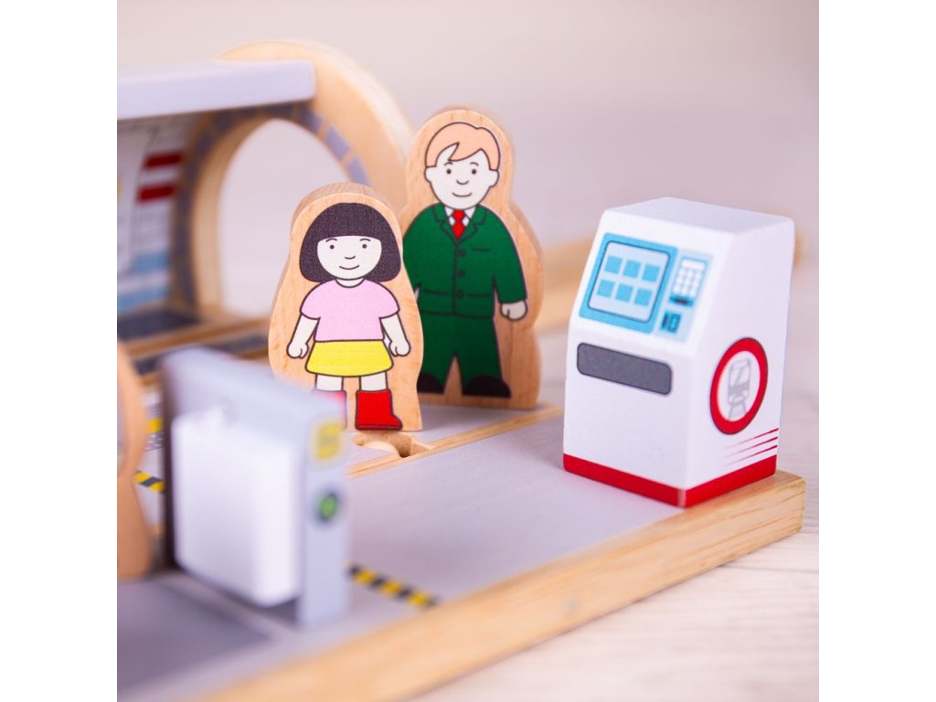 Na první kolej přijíždí souprava metra, prosíme, nepřekračujte žlutou čáru! Stanice metra je dřevěnou replikou ikonické londýnské zastávky metra, kde si cestující zakoupí lístky, projdou bránou a nastoupí do metra. Tato dřevěná hračka obsahuje automat na jízdenky, bránu pro označení jízdenek a 3 postavičky pasažérů. Hlavní vlastnosti: vláčkodráhy a jejich příslušenství značky Bigjigs Rail je možno kombinovat se všemi dalšími dřevěnými vláčkodráhami na trhuvyrobeno z kvalitních a zodpovědně získaných přírodních materiálůodpovídá současným evropským bezpečnostním normámpodporuje představivost, obratnost a koordinaci
