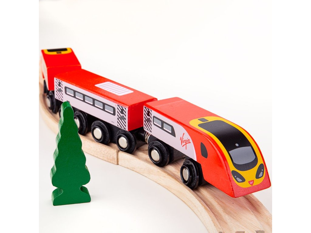 Cestujte stylově na Virgin Pendolinu. Tato dřevěná replika ikonického vlaku ve stylu Pendolino vám přináší spolupráci mezi Bigjigs Toys a Virgin Trains. Toto dřevěné Virgin Pendolino je dodáváno se dvěmi lokomotivami, vagónkem a 1kusem dlouhé koleje BJT100 a 1ks střední koleje BJT101. Hlavní vlastnosti: vláčkodráhy a jejich příslušenství značky Bigjigs Rail je možno kombinovat se všemi dalšími dřevěnými vláčkodráhami na trhuvyrobeno z kvalitních a zodpovědně získaných přírodních materiálůodpovídá současným evropským bezpečnostním normámpodporuje představivost, obratnost a koordinaci