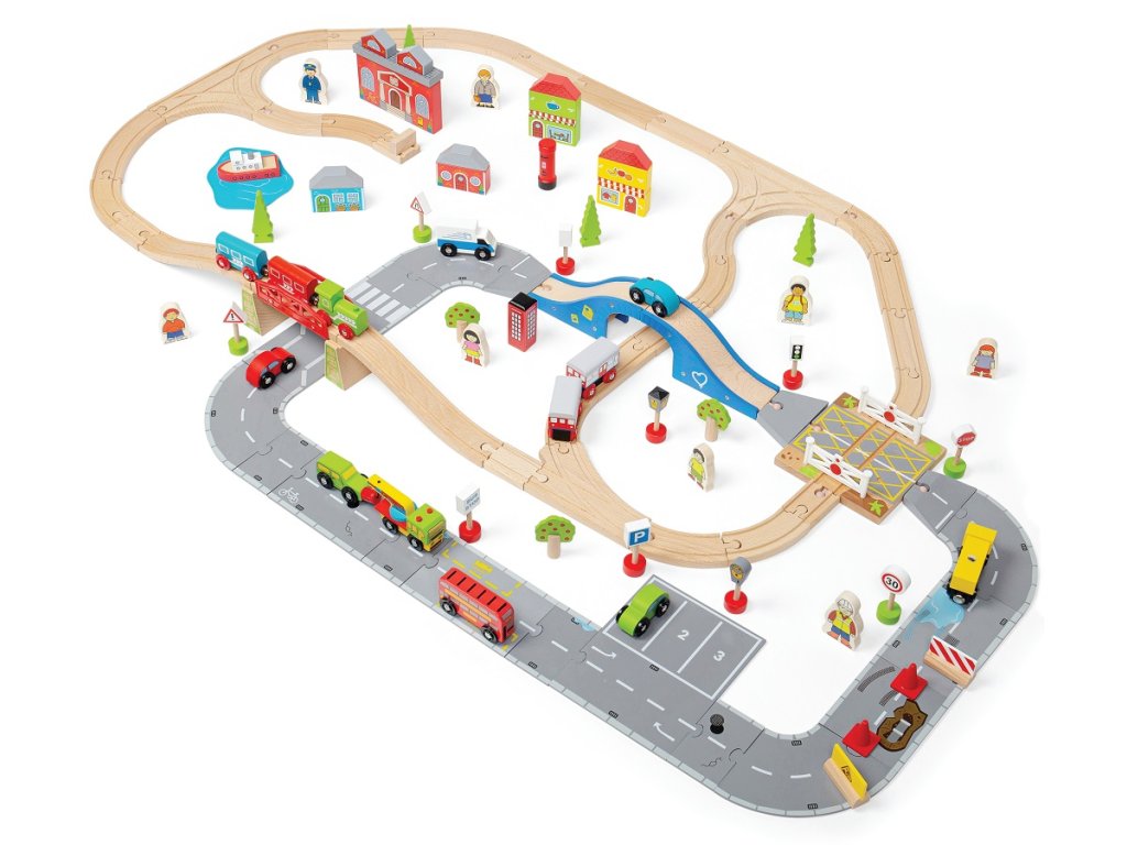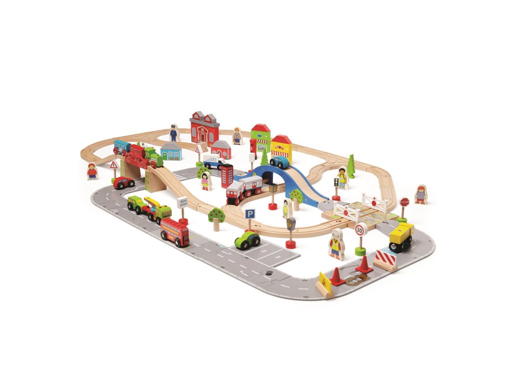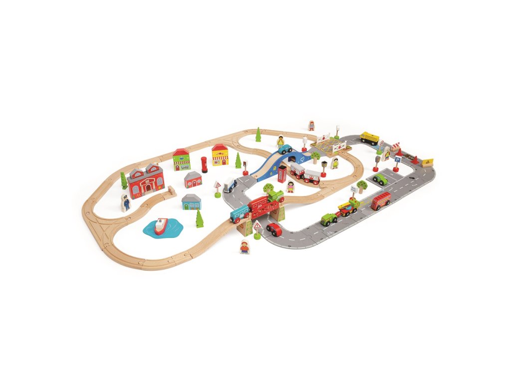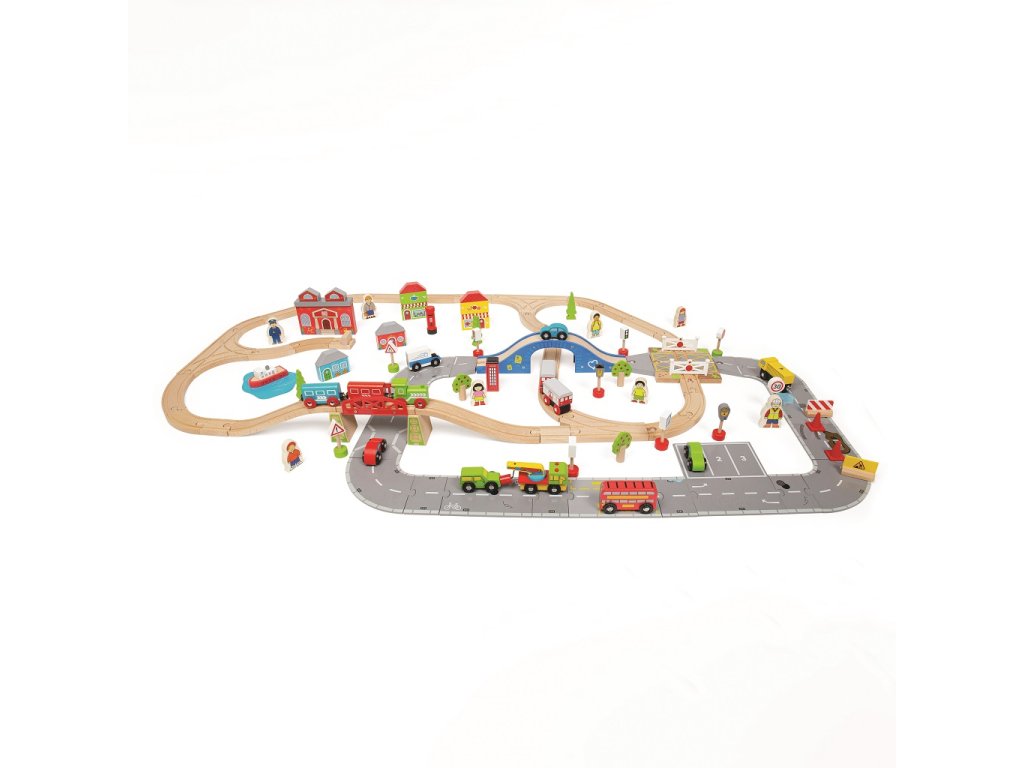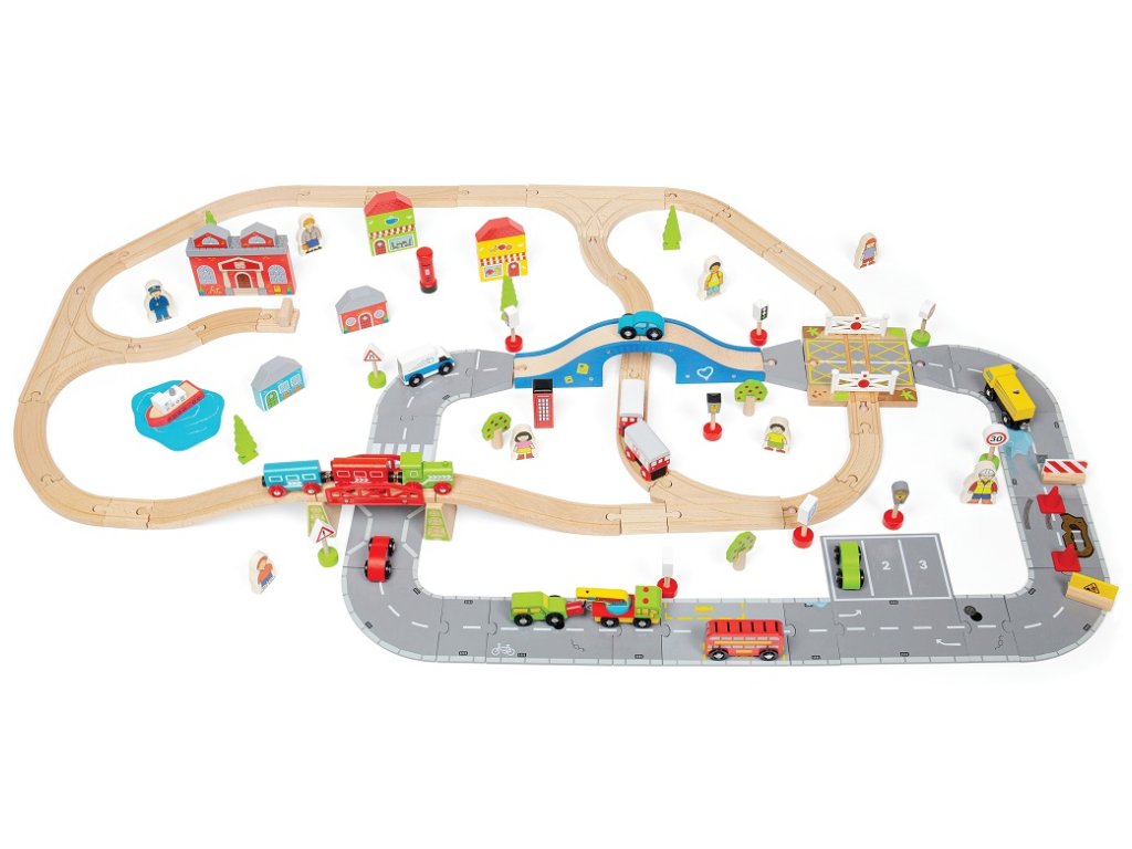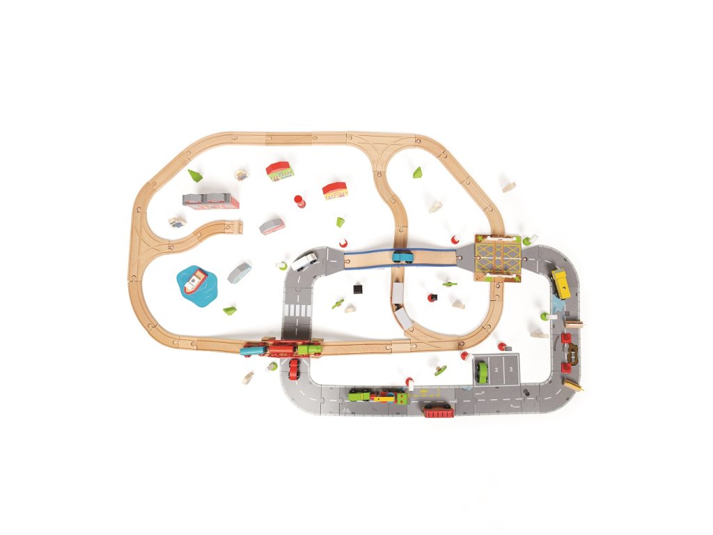 Užijte si najednou vláčkodráhu a autodráhu! Tento rozsáhlý dřevěný set nabízí prostor pro hru s představivostí, obsahuje hodně doplňků, které upoutají pozornost dětí. Vlaky a auta se potkají na křižovatce železničního přejezdu, cestující čekají ve vlakové stanici, set má dokonce loď, která pasažéry přenese přes jezero! Propojuje koleje a cesty a tak si děti mají pořád s čím hrát. K rozšíření setu je možno dokoupit další doplňky. Hlavní vlastnosti: vláčkodráhy a jejich příslušenství značky Bigjigs Rail je možné kombinovat se všemi dalšími dřevěnými vláčkodráhami na trhuvyrobeno z kvalitních a zodpovědně získaných přírodních materiálůodpovídá současným evropským bezpečnostním normámpodporuje představivost, obratnost a koordinaci