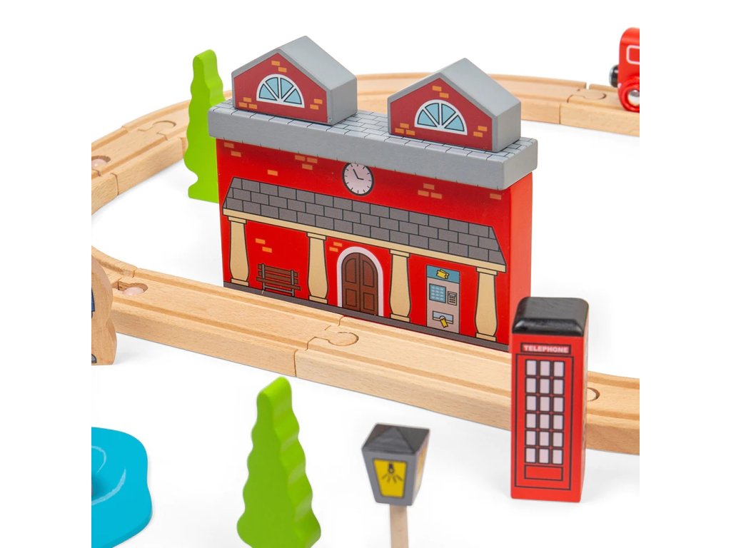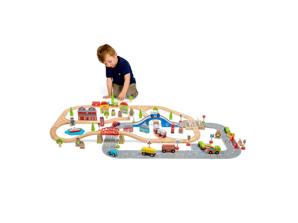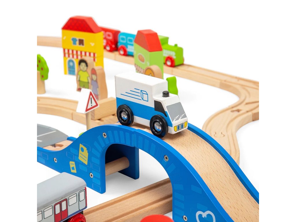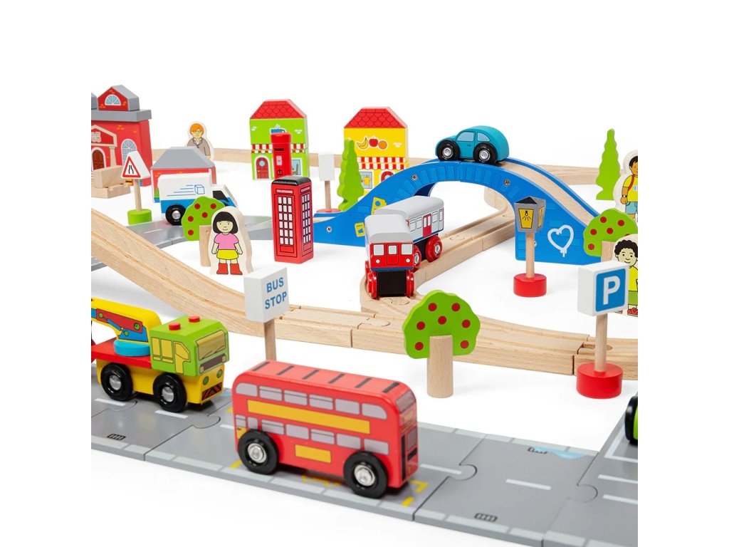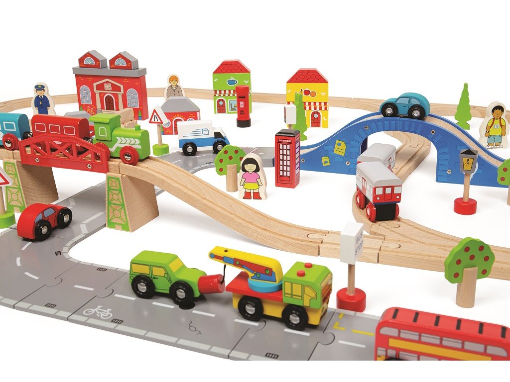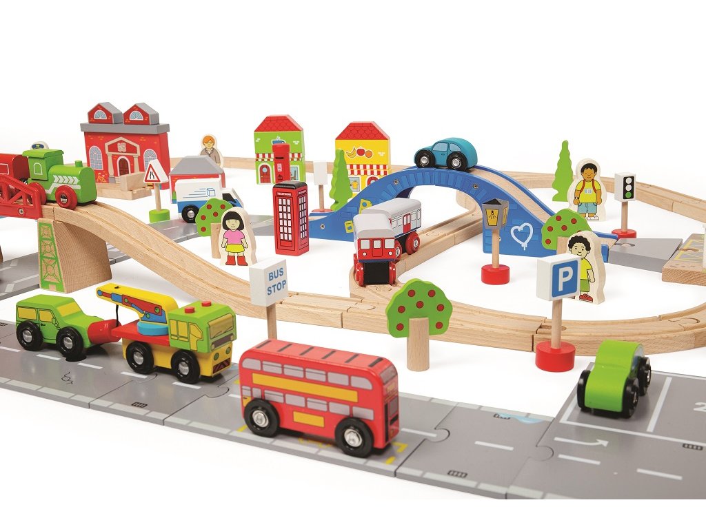 Užijte si najednou vláčkodráhu a autodráhu! Tento rozsáhlý dřevěný set nabízí prostor pro hru s představivostí, obsahuje hodně doplňků, které upoutají pozornost dětí. Vlaky a auta se potkají na křižovatce železničního přejezdu, cestující čekají ve vlakové stanici, set má dokonce loď, která pasažéry přenese přes jezero! Propojuje koleje a cesty a tak si děti mají pořád s čím hrát. K rozšíření setu je možno dokoupit další doplňky. Hlavní vlastnosti: vláčkodráhy a jejich příslušenství značky Bigjigs Rail je možné kombinovat se všemi dalšími dřevěnými vláčkodráhami na trhuvyrobeno z kvalitních a zodpovědně získaných přírodních materiálůodpovídá současným evropským bezpečnostním normámpodporuje představivost, obratnost a koordinaci