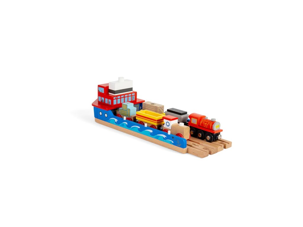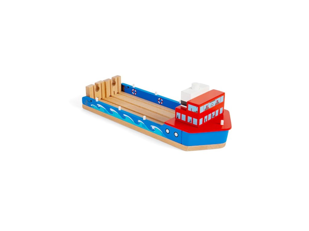 Děti mohou být kapitánem své vlastní lodi s tímto působivým doplňkem „trajektového“ vlaku. Bigjigs Rail Train Ferry obsahuje modré plavidlo s červenou kormidelnou, namalovanými vlnami na každé straně a kruhy záchranných kruhů. Parkovací paluba je v barvě přírodního dřeva. Má také sklopnou nájezdovou rampu, která umožňuje nájezd a výjezd přepravovaných vlaků. Je skvělým doplňkem pobřežní vlakové soupravy nebo pirátské vlakové soupravy, která je dodávána s mostem pro vlaky, aby se dostaly přes burácející vlny. Hodí se také k ostatním vláčkovým dráhám. Většina ostatních hlavních značek dřevěných železnic je kompatibilní s dřevěnými vlakovými soupravami a příslušenstvím Bigjigs Rail. Vyrobeno z vysoce kvalitních, zodpovědně získaných materiálů. Splňuje aktuální evropské bezpečnostní normy. Železniční vozy viditelné na fotografiích nejsou součástí této nabídky, lze je zakoupit samostatně. Hlavní vlastnosti: vyrobeno z vysoce kvalitních, zodpovědně získaných materiálůsyté, zdravotně nezávadné barvykompatibilní s jinými značkami dřevěných železnicrozvíjí představivost, obratnost a koordinacivhodné od 3 let