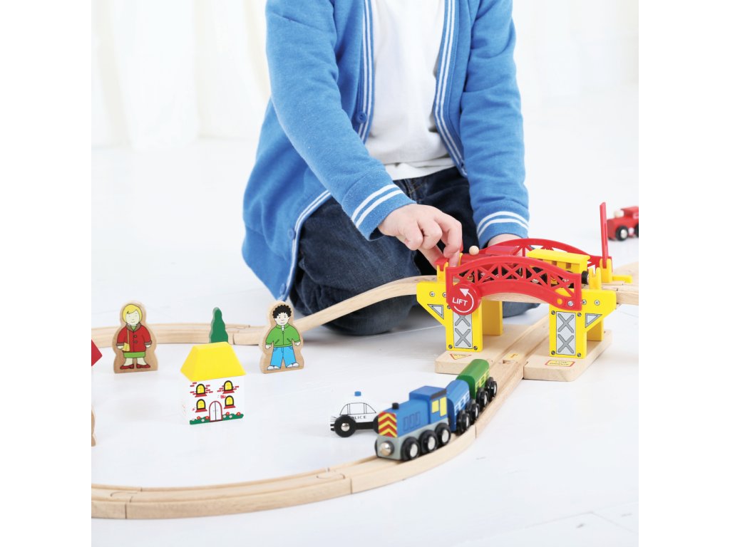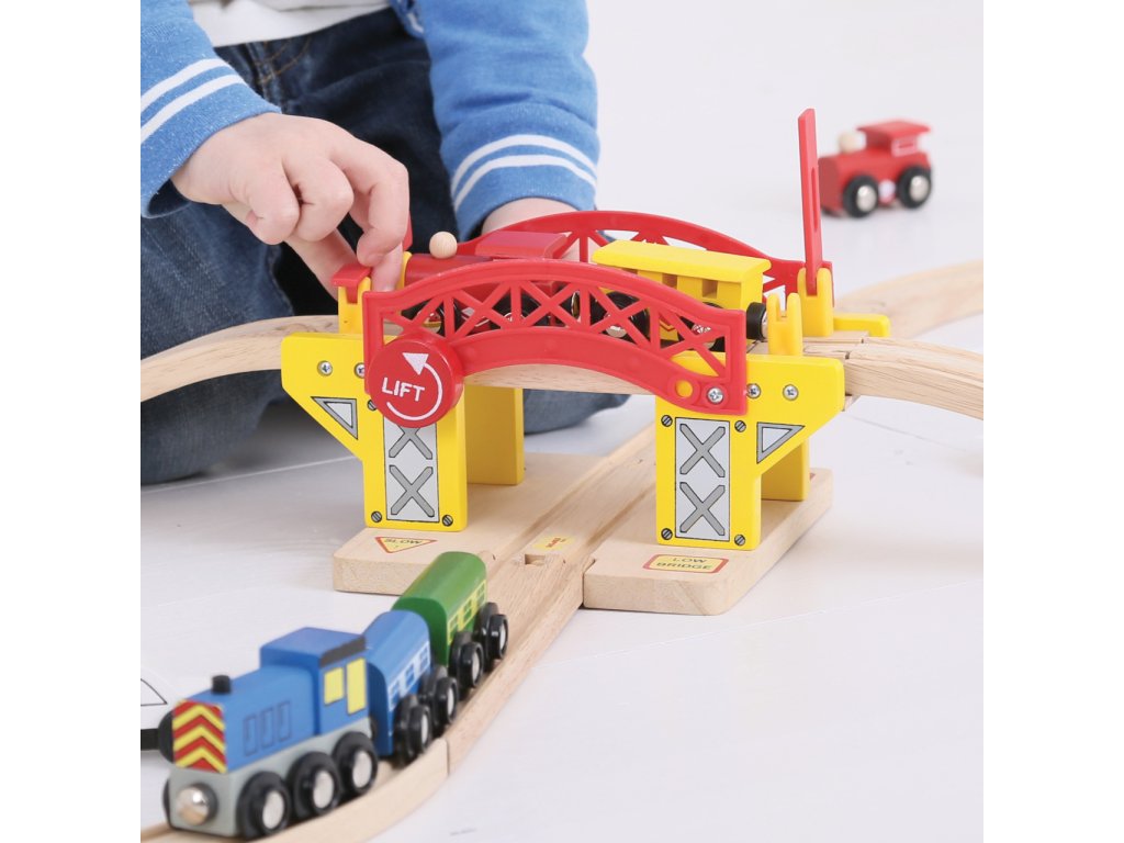 Děti milují vysoké zvedací mosty, zvedání mostu a spouštění brány. Samozřejmě i projíždějící vlaky pod nimi uspokojí nejednoho železničního inženýra. Délka mostu: 64 cm vč. nájezdů. Hlavní vlastnosti: kompatibilní se všemi dalšími dřevěnými vláčkodráhami na trhuvyrobeno z kvalitních a zodpovědně získaných přírodních materiálůodpovídá současným evropským bezpečnostním normámpodporuje představivost, obratnost a koordinaci