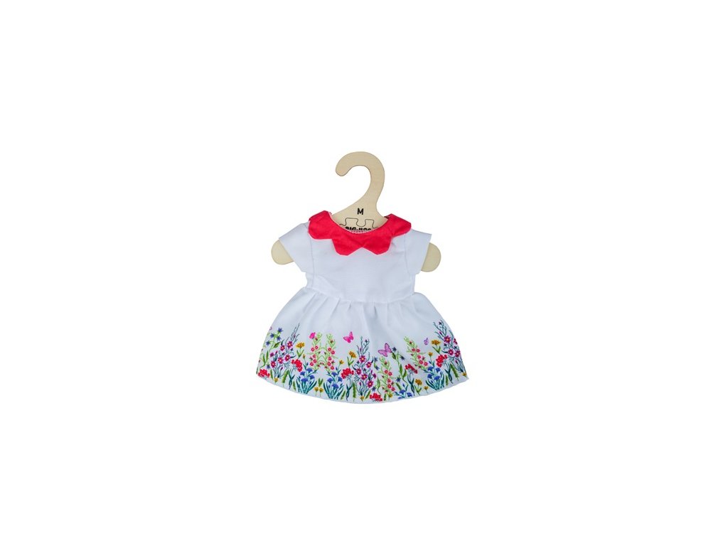Bílé květinové šaty s červeným límečkem. Šaty lze obléci na panenky velikosti 34cm. Součástí balení je také věšáček. Hlavní vlastnosti: vhodné pro panenky o velikosti 34 cmtrénuje motoriku hravou formouvčetně věšáčku