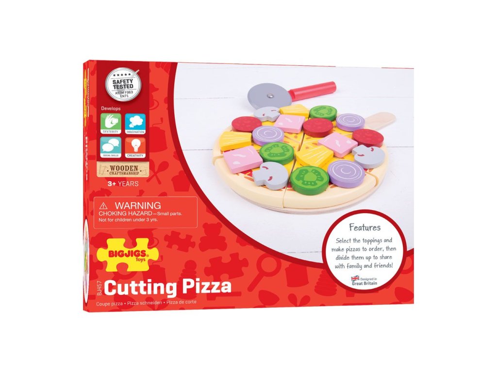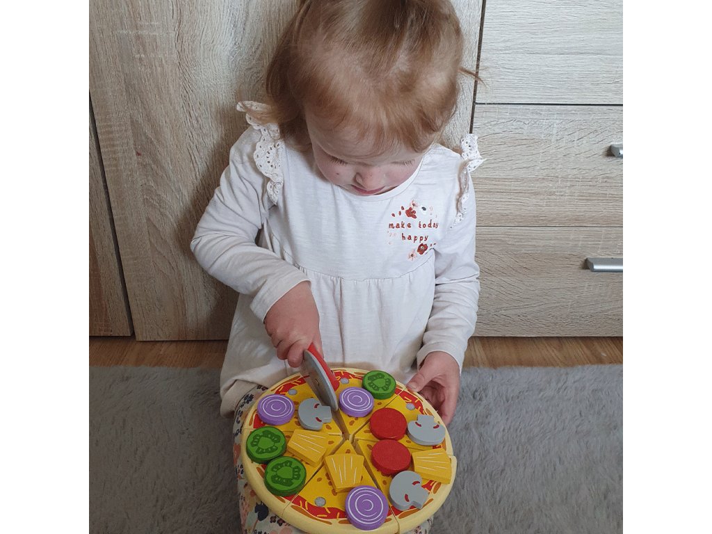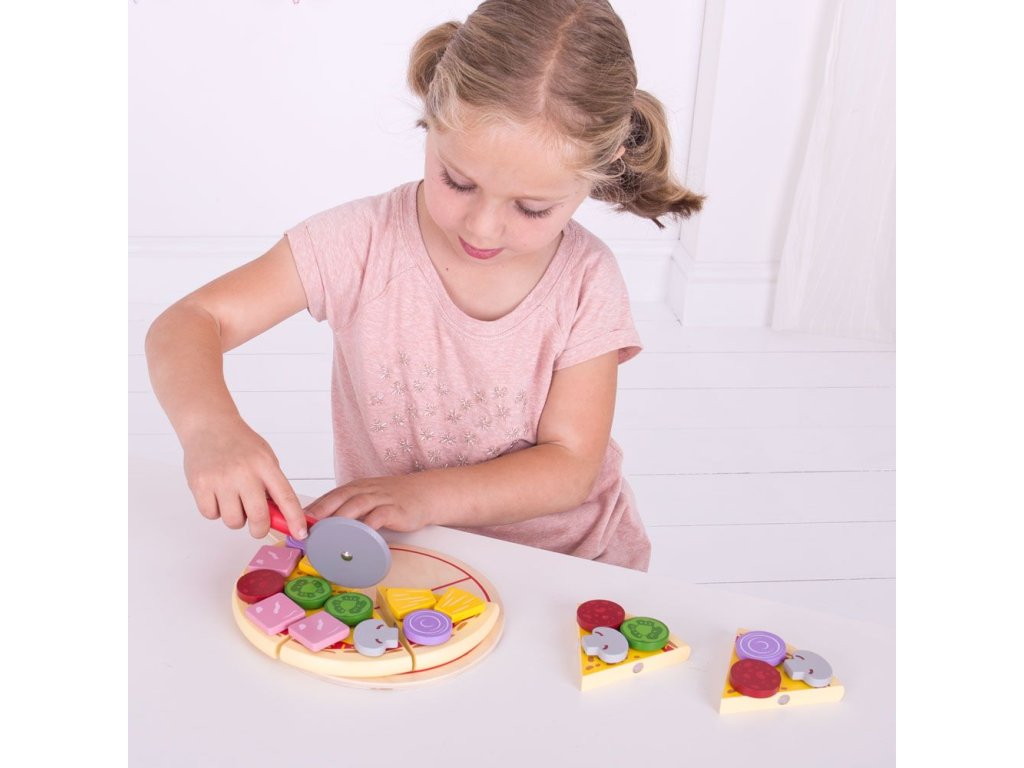 Šest lahodných plátků dřevěné pizzy s nejrůznějšími dřevěnými ingrediencemi, je z čeho vybírat. Vyberte si ingredience a připravte pizzy na objednávku pro přátele a rodinu. Pizzu řežte jednoduše dřevěným kráječem pizzy a podávejte ji na dřevěné podložce nebo na Bigjigs Toys jídelní sadě (BJ617). Podporuje interaktivní a nápadité hraní rolí a rozvíjí sociální dovednosti a obratnost. Dřevěná servírovací podložka obsahuje také naznačené zlomky, které vám pomohou rozvíjet matematické schopnosti. BigJigs je velký fanoušek zdravé výživy a jaká by byla lepší cesta učit děti o zdravé výživě, než pomocí hraček z našeho sortimentu? Dřevěné hrací jídlo je ideální k tomu, aby se vaše dítě dozvědělo o důležitosti zdravé a vyvážené stravy. A také o tom, odkud naše jídlo pochází a jak ho připravujeme. Součástí balení je vše dle obrázku. Hlavní vlastnosti: podporuje kreativní a nápadité hranívyrobeno z vysoce kvalitních, zodpovědně získaných materiálůsplňuje aktuální evropské bezpečnostní normy