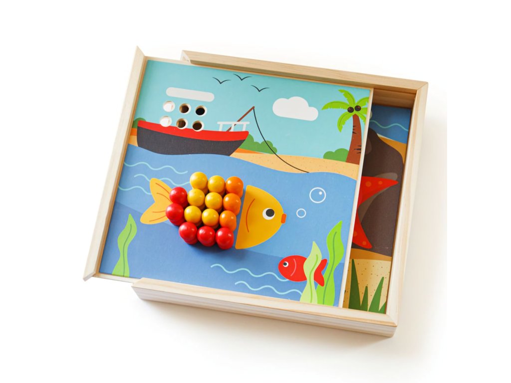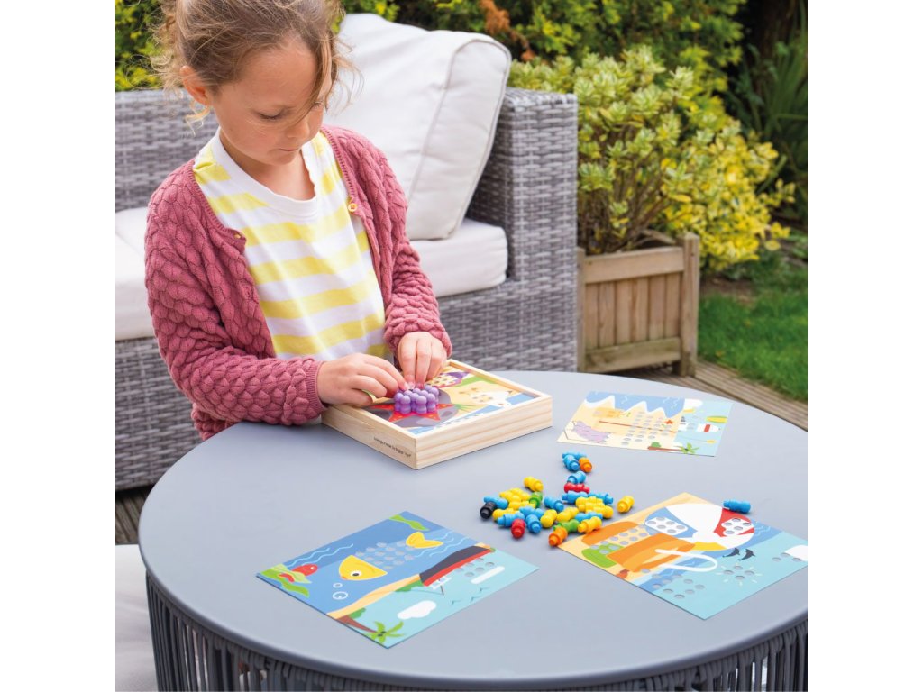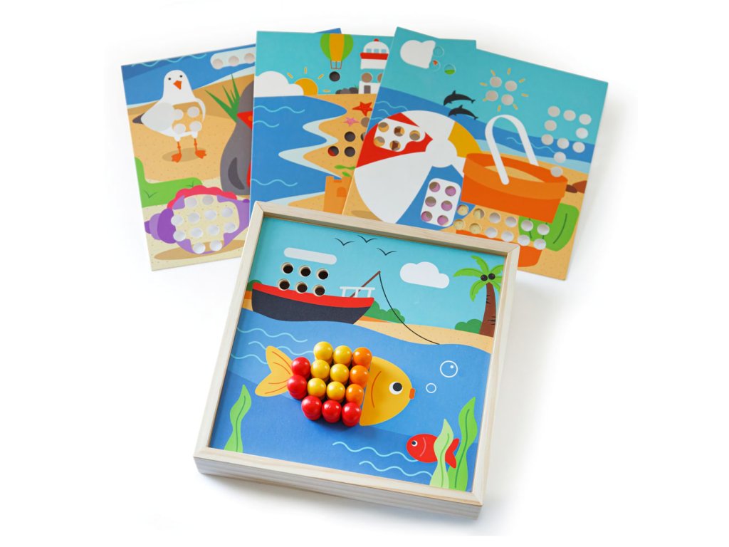 Rozehrajte obrázky s motivy pláže pomocí různobarevných kolíčků. Umisťujte je v souladu s okolními barvami, nebo dle vlastní fantazie. Nechejte děti hrou rozpoznávat barvy, rozvíjet poznávací dovednosti, soustředění i zručnost. Obrázky se umisťují na víko kompaktní krabičky, do které můžete všechny součásti prakticky uložit. Mozaika tak může být vždy uklizená i připravená na cesty. Všechny součásti jsou vyrobeny z kvalitního a odpovědně získaného dřeva, které je příjemné na dotek, a pomáhá tak přirozeně stimulovat hmat. Hlavní vlastnosti:4 obrázky a 96 kolíčků (8 různých barev)praktické baleníatraktivní dřevěné zpracování