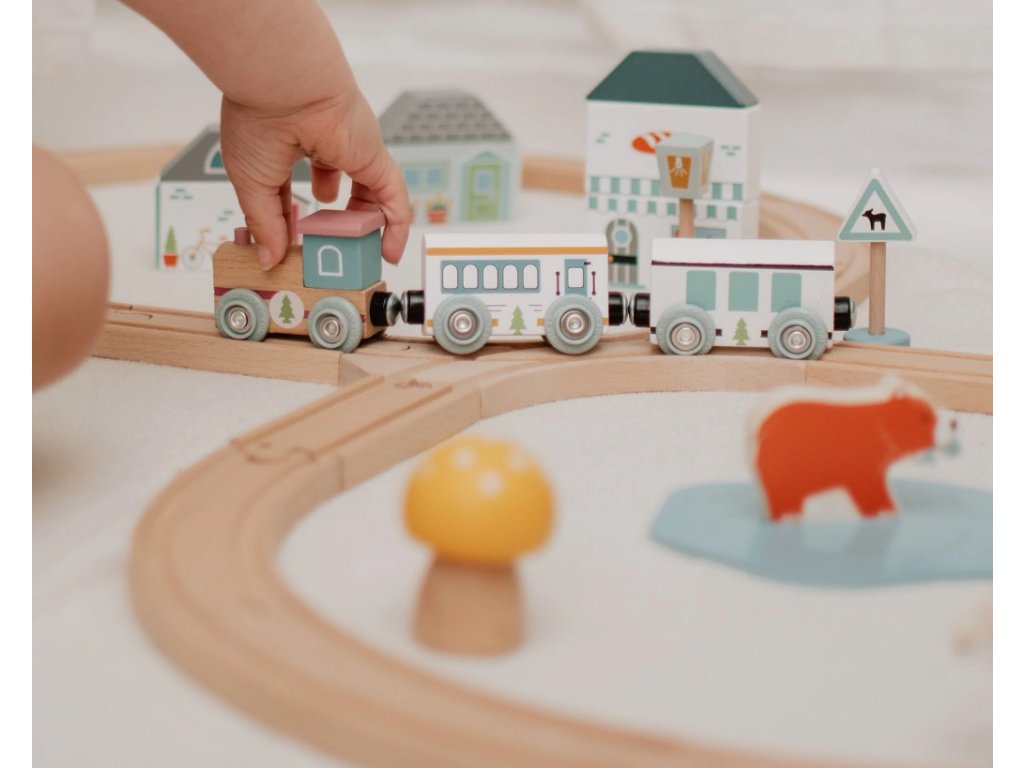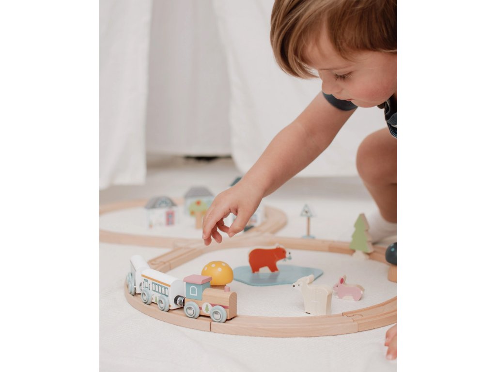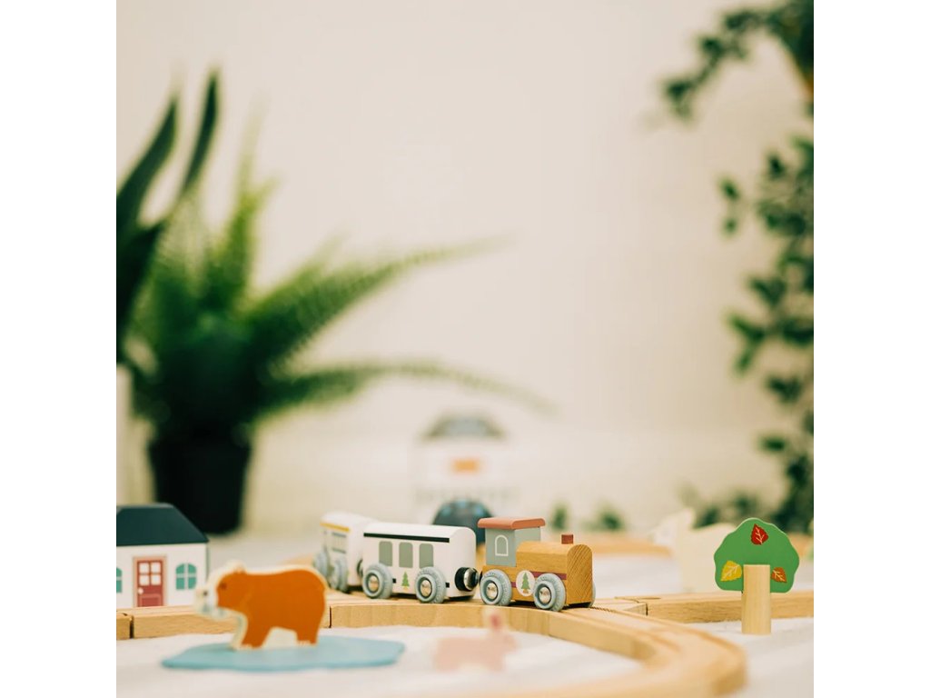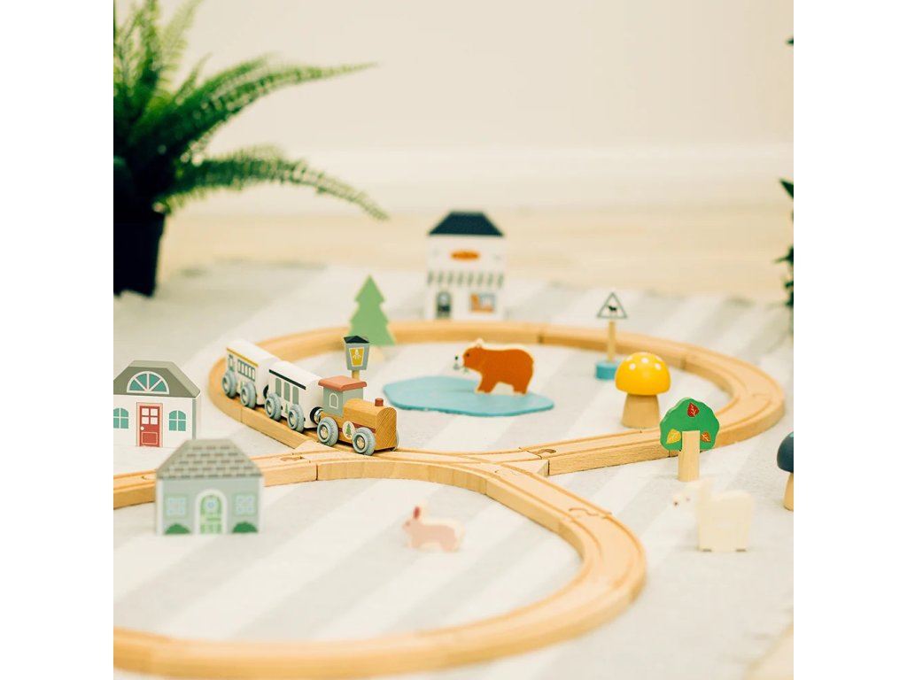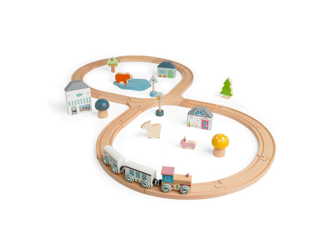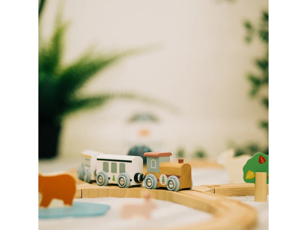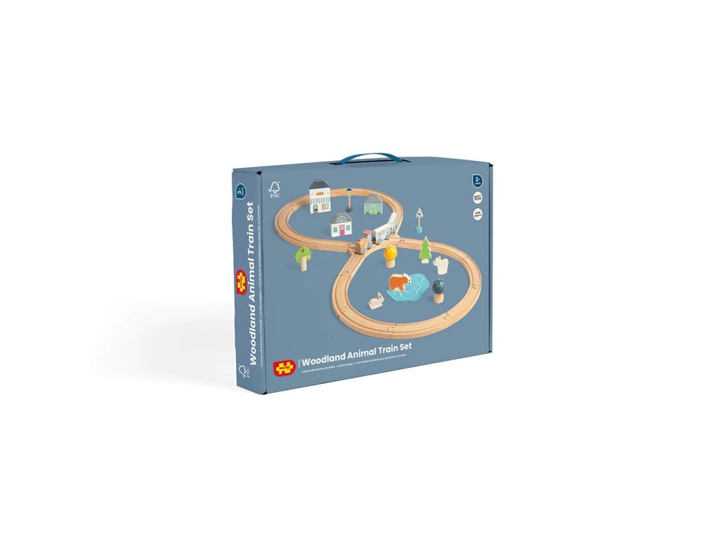 Prozkoumejte zázraky lesa s touto krásnou dřevěnou vláčkodráhou. Tato vláčkodráha má tvar osmičky. Děti budou při své jízdě projíždět kolem muchomůrek, borovic a rozkošných lesních zvířátek, ale také kolem kavárny nebo pekárny. Je vyrobena z vysoce kvalitního, udržitelně těženého dřeva s certifikací FSC®. Splňuje aktuální evropské bezpečnostní normy. Dodáváno včetně lesních zvířat, budov a stromů. Hlavní vlastnosti: vyrobeno eticky z udržitelného dřeva s certifikací FSC®odpovídá současným evropským bezpečnostním normámpodporuje představivost, obratnost a koordinacikompatibilní s vláčkodráhami dalších výrobcůvčetně lesních zvířat, budov a stromůatraktivní zpracování Značka a certifikát FSC® (Forest Stewardship Council) zaručuje, že dřevo, ze kterého byl produkt vyroben, nebylo vytěženo nelegálně a pochází z lesů obhospodařovaných šetrným či přírodě blízkým způsobem, ve kterém jsou dodržovány přísné environmentální a sociální požadavky. Značka FSC® na výrobku znamená, že svým nákupem pomáháte chránit lesy a podporujete šetrné, odpovědné či přírodě blízké hospodaření, díky kterému jsou naše lesy stabilnější, zdravější, mají přirozenou druhovou skladbu a lépe odolávají negativním následkům klimatických změn.