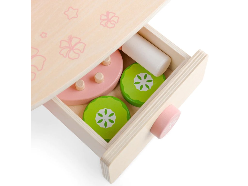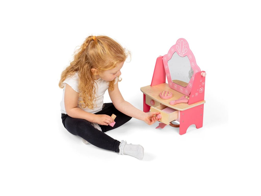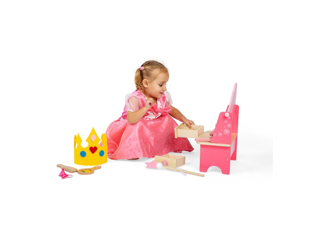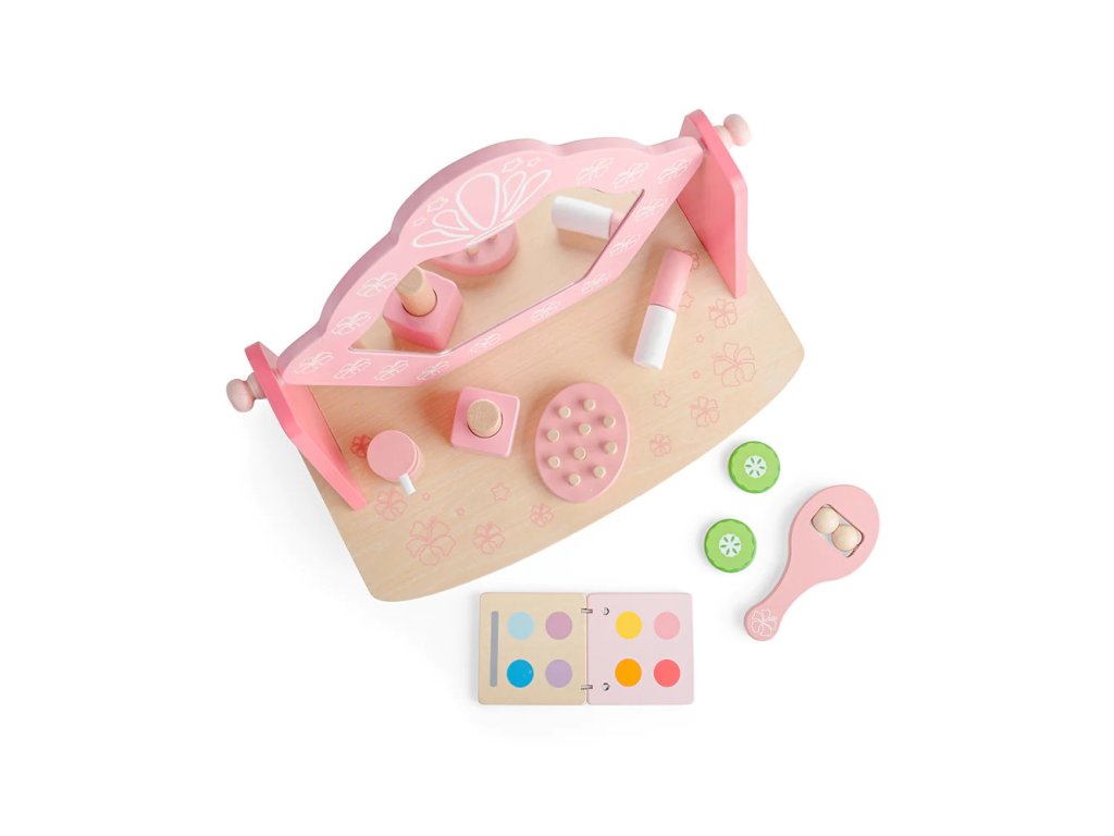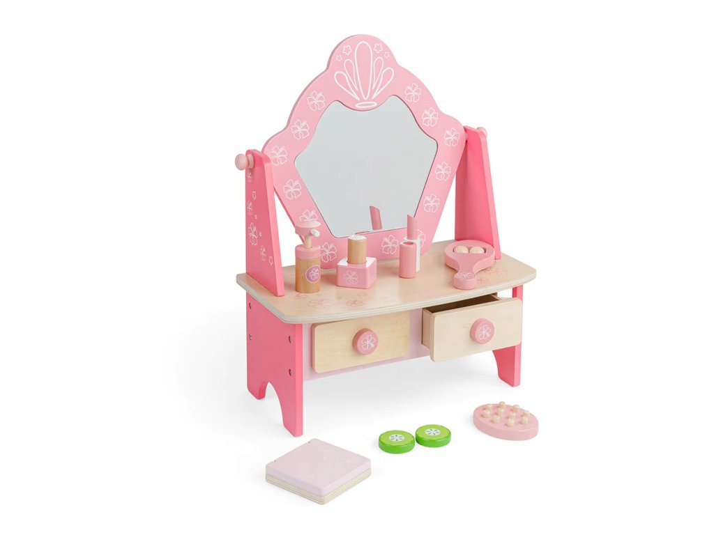 Kdo je ze všech nejkrásnější? Krásný růžový dětský toaletní stolek je dokonalým doplňkem pro holčičky, aby si dopřály předstírané hýčkání a líčení. Zabaví je na dlouhé hodiny. Stolek je dekorován v nádherných růžových odstínech s květy ibišku. Vhodný doplněk do dětských pokojíčků nebo heren. Toaletní stolek se zrcadlem má dvě zásuvky, kam si holčičky mohou uložit své doplňky, jako je dřevěný kompakt na make-up, plátky okurky, váleček na obličej, kartáč na vlasy, rtěnku, parfém či lak na nehty. Ideální pro nápadité předstírané hry. Vyrobeno z kvalitních materiálů z odpovědných zdrojů. Odpovídá evropské bezpečnostní normě. Hlavní vlastnosti: odolné provedenízabudované zrcadlo2 zásuvky