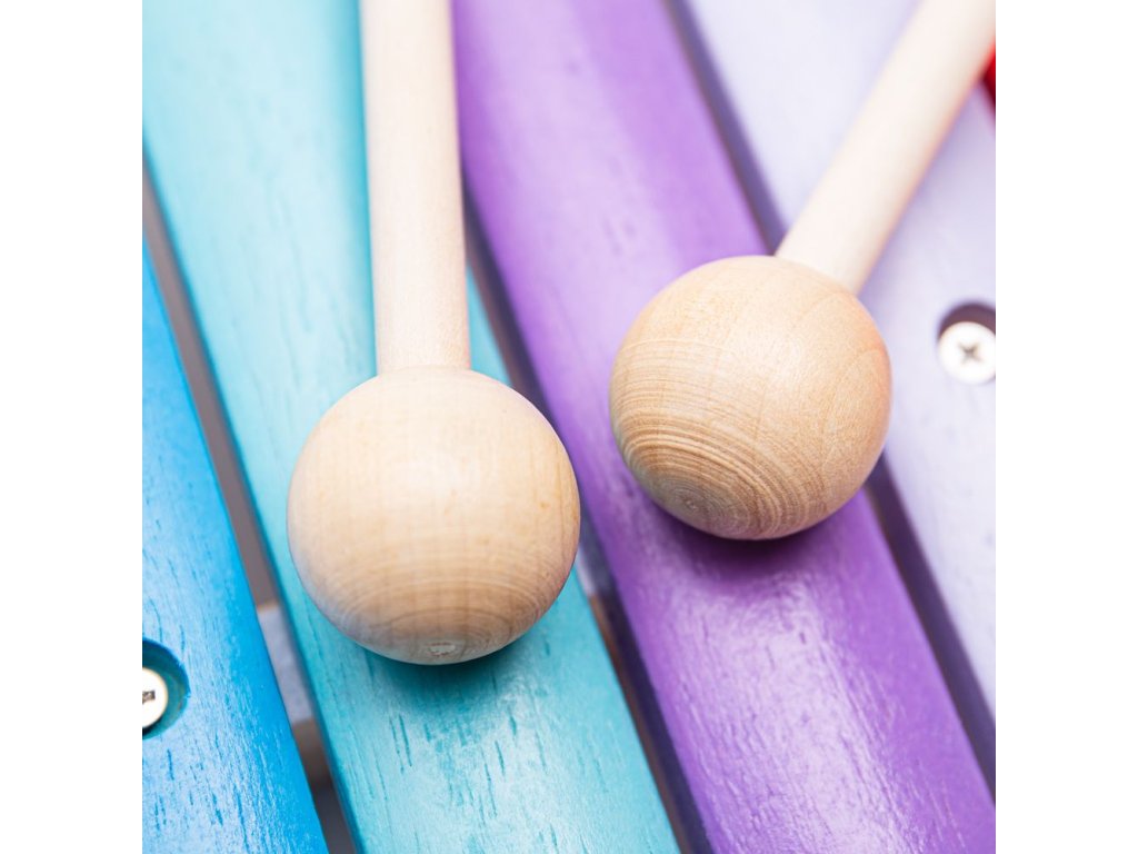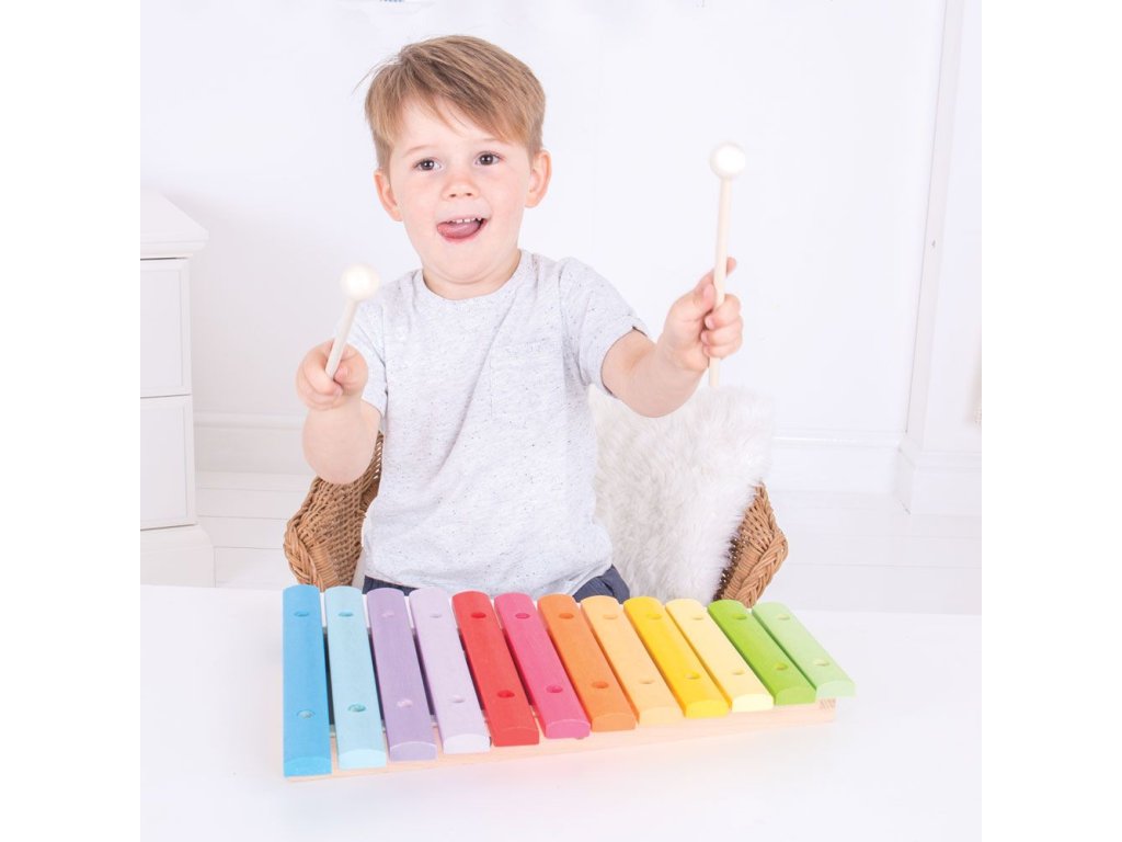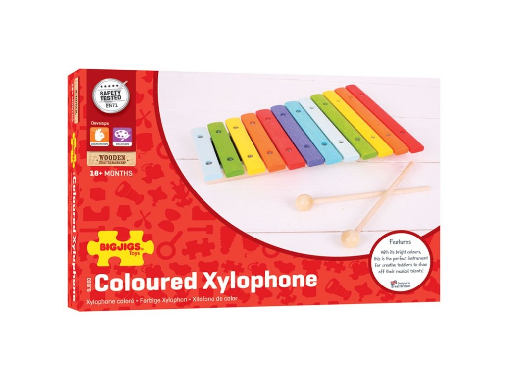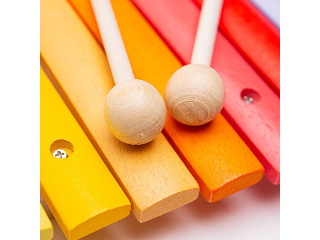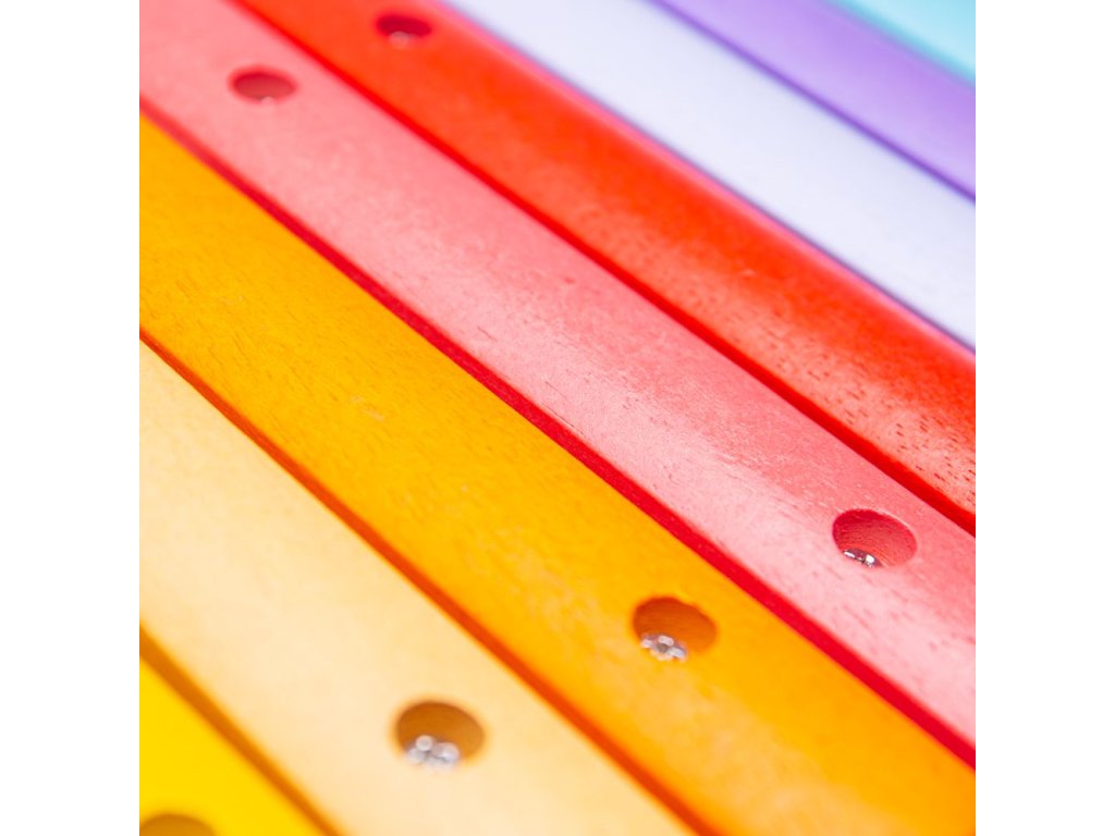 Co může být lepšího než dřevěný a barevně pestrý xylofon? Vaše dítě si může vytvářet své první melodie, nebo hrát své oblíbené písničky, a díky tomu tato hračka nebude pro něj zklamáním, ale velkou zábavou. Vhodná hračka i pro vaše batole. Oproti obrázku je na xylofonu viditelné uchycení klapek malými šroubky. Hlavní vlastnosti: učí děti o rytmu a hudbědřevěná hračka