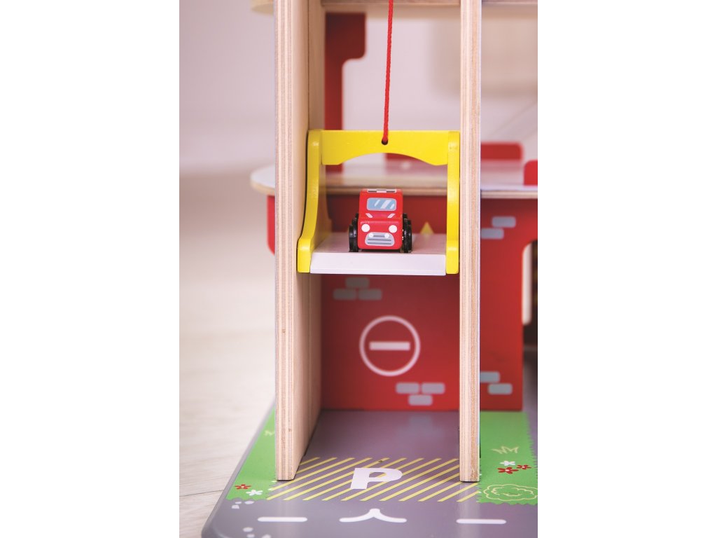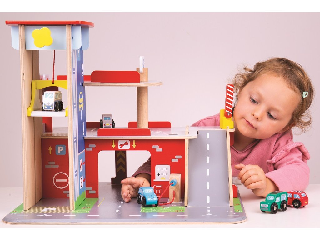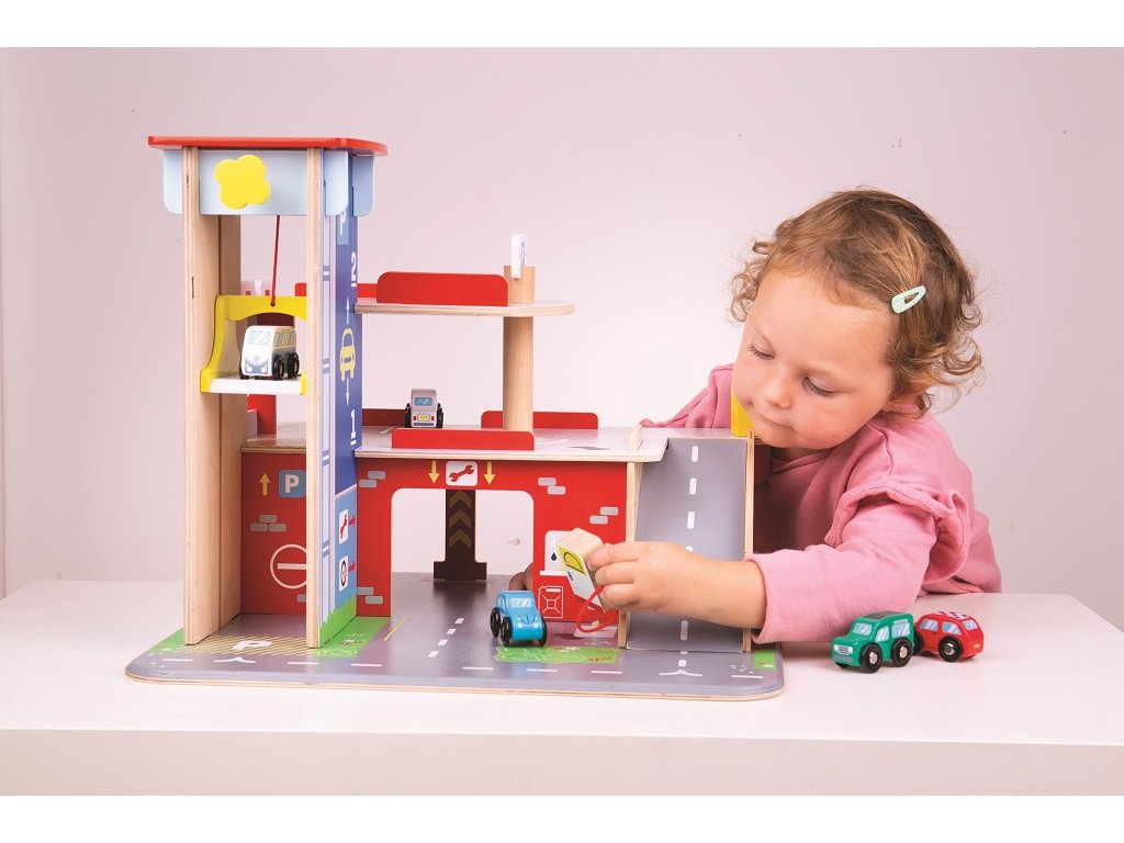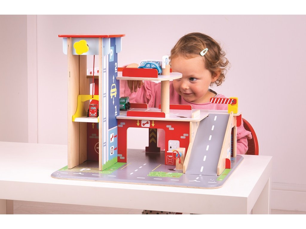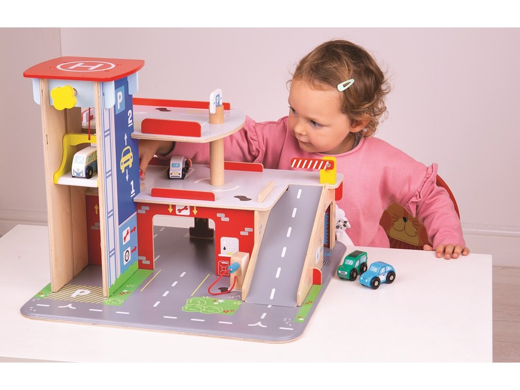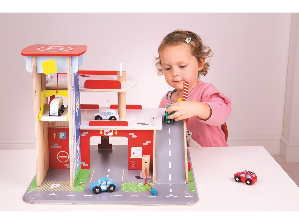Děti si užijí hru plnou zábavy na každém ze tří pater garáže s parkovištěm. V přízemí mohou autem vjet na fungující výtah a poté vyjet až do druhého patra a zaparkovat. V přízemí děti najdou servis, myčku i pumpu. Z prvního patra mohou auta odjíždět za pomocí výtahu nebo po rampě, ale pozor, auta musí počkat na zvednutí závory! Nejvyšším bodem garáže je heliport. Tato garáž má prostě vše, co malý řidič potřebuje pro dopravení se z bodu A do bodu B. Podporuje kreativitu a představivost. Vyvíjí koordinaci ruka-oko, jemnou motoriku a zručnost. Možno doplnit autíčky Bigjigs Toys a Bigjigs Rail. Vyrobeno z kvalitních materiálů z odpovědných zdrojů.  Hlavní vlastnosti: 3 patra s parkovištěm a heliportemfunkční výtahservis, myčka i pumpa v přízemí