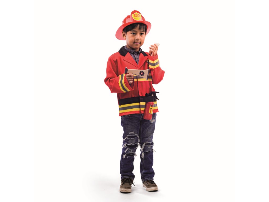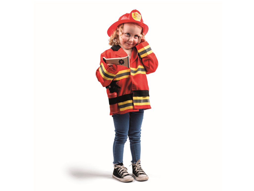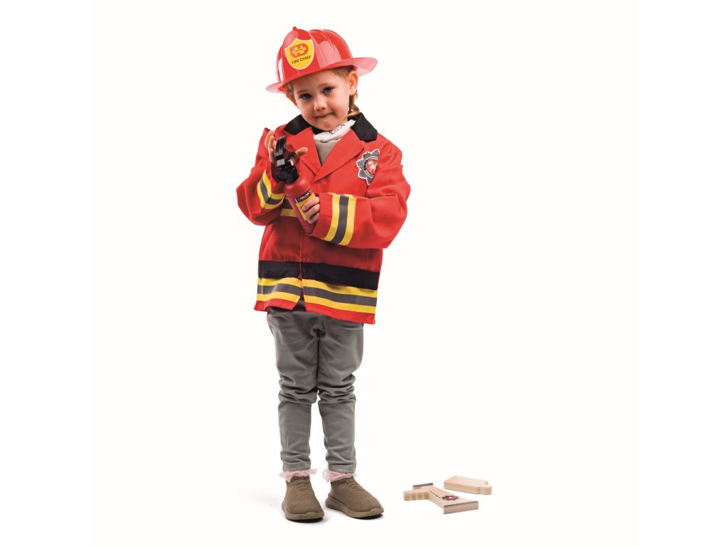 Malí hrdinové mohou přijít na pomoc v tomto dětském kostýmu hasiče. Ať už jde o hašení požárů, nebo záchranu koček ze stromů, možnosti předstírané hry jsou nekonečné. Součástí této dětské sady je jasně červená hasičská bunda s pruhovanými rukávy a odznakem, dřevěný hasicí přístroj, vysílačka a megafon. Zapínání je na suchý zip pro snadné oblékání a svlékání. Helma je nastavitelná, obvod hlavy 49-55 cm. Kostým byl testován podle nejnovějších předpisů EN71. Hlavní vlastnosti: včetně příslušenstvínastavitelná helmavhodné pro děti od 3 do 5 letnápadité a detailní zpracování