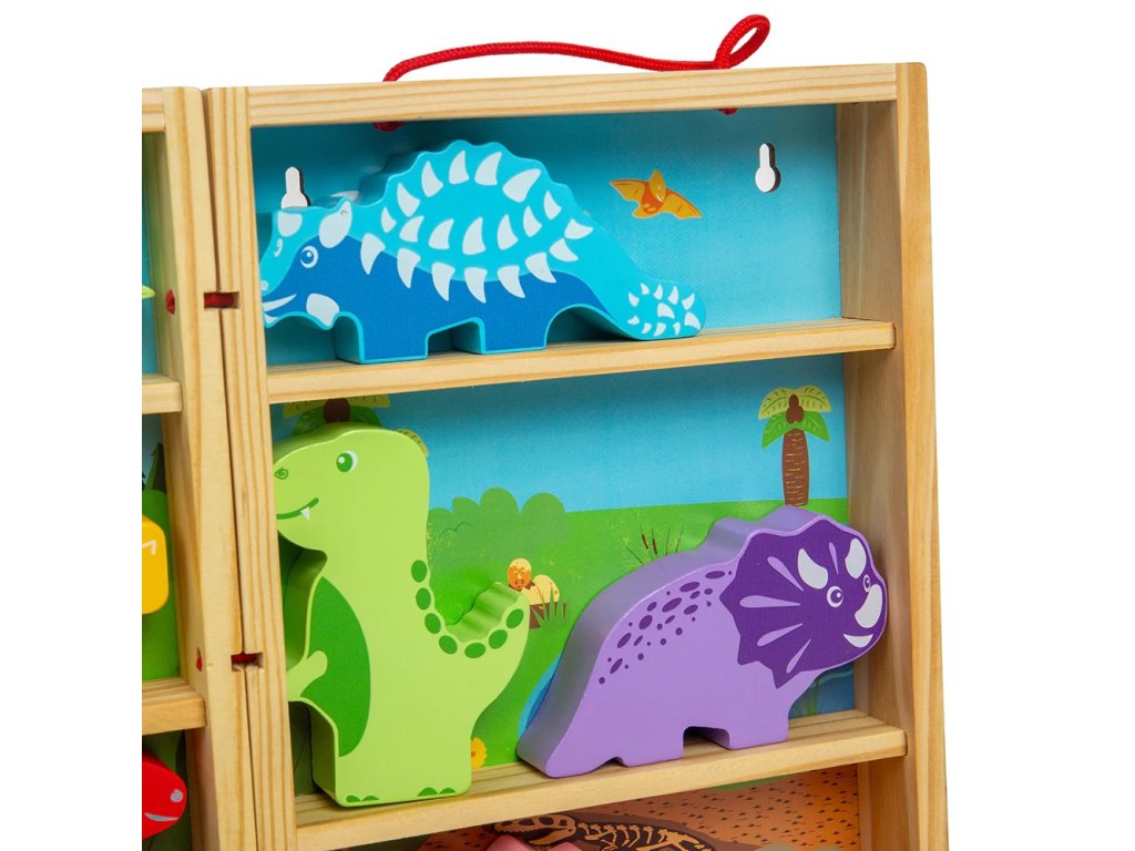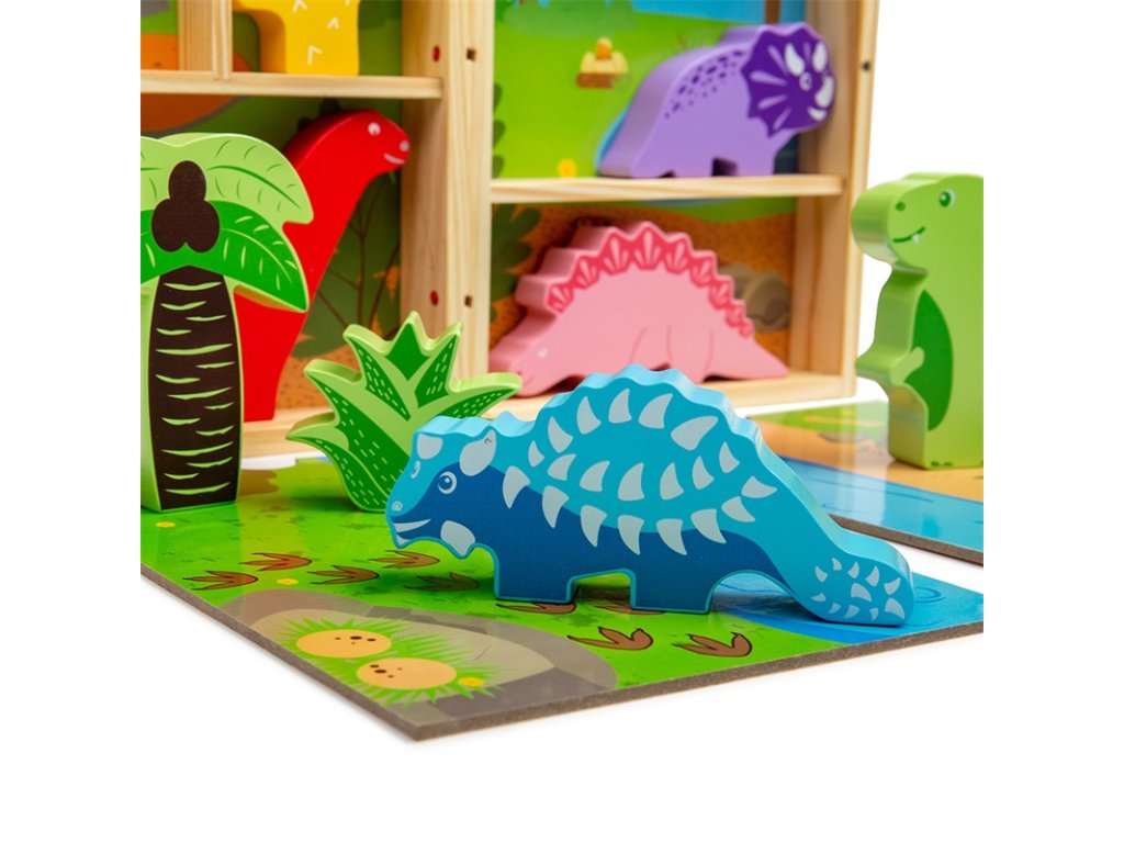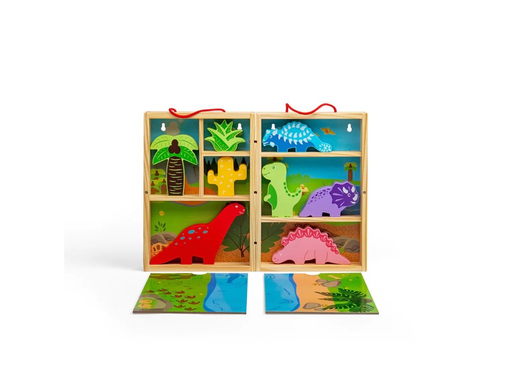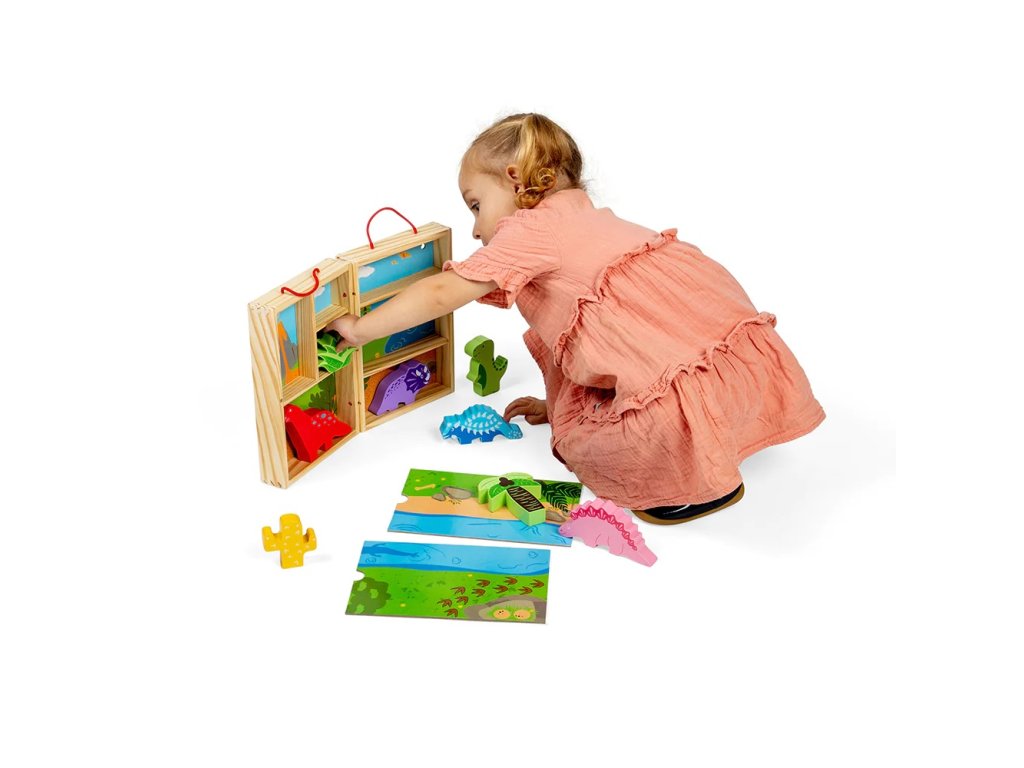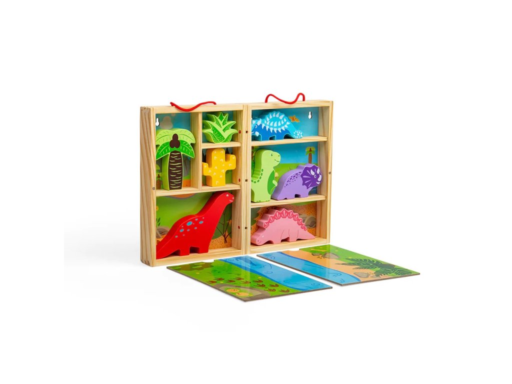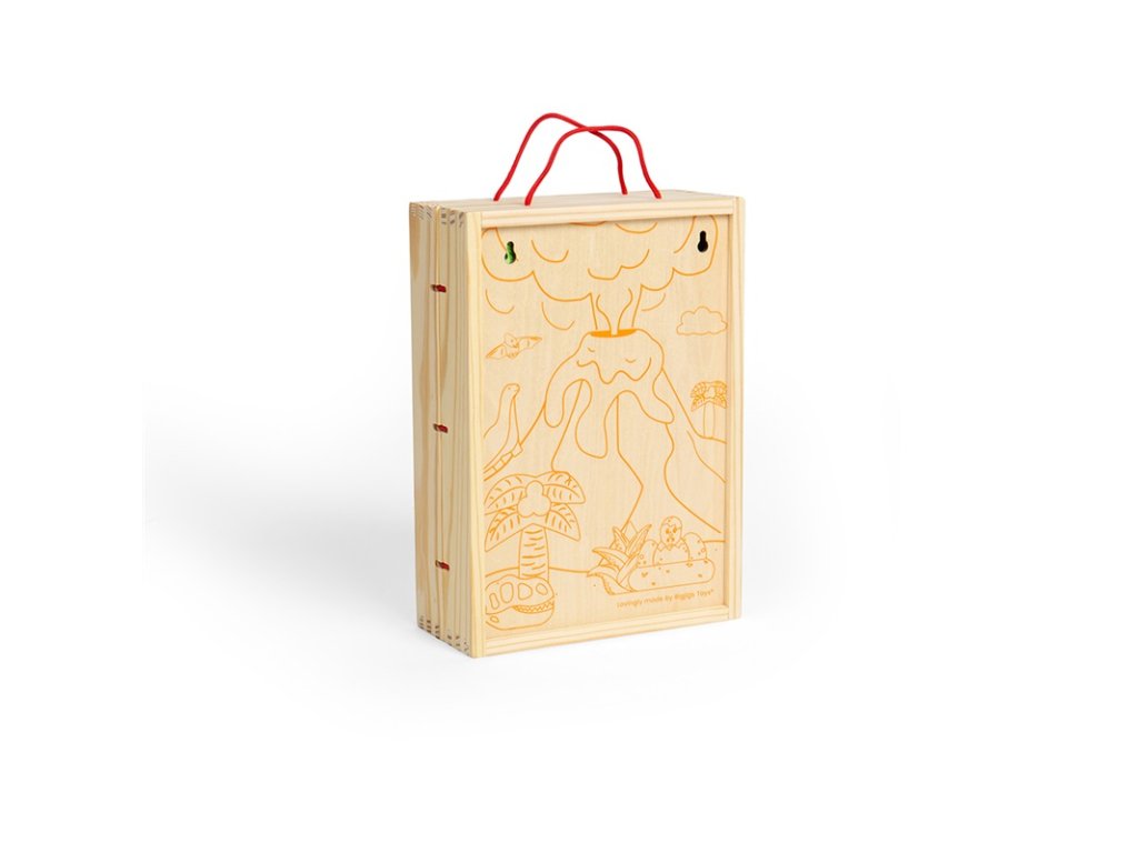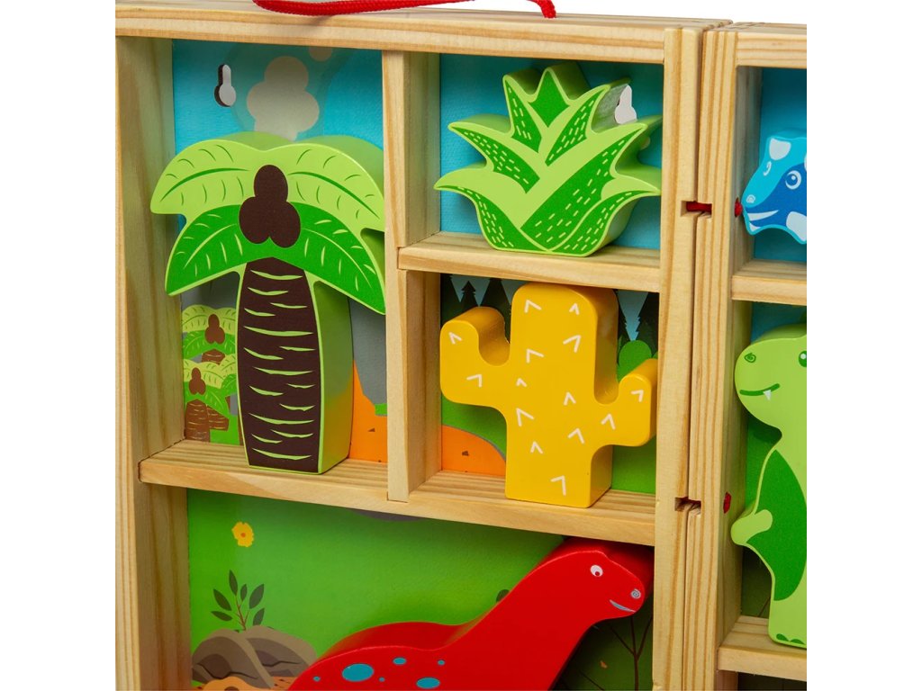Přenosná krabička stylizovaná do světa dinosaurů, kterou sebou můžete vzít kamkoli. Děti od 18 měsíců můžou pomocí této hračky objevovat starý svět plný dinosaurů. Podporuje kreativitu a představivost. Hladké robustní hrací figurky mají ideální velikost pro malé ručičky k uchopení, zkoumání a výměně. Hlavní vlastnosti: přenosnost, ideální na cestovánívyrobeno ze dřevamasivní kouskyvhodné již od 18 měsícůobsahuje hrací krabici, dinosaury a rozkládací podložku na hraní, kaktus, aloe vera, palmu