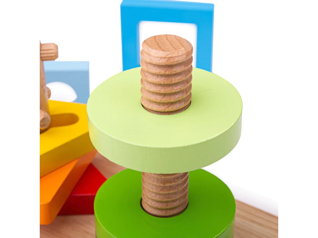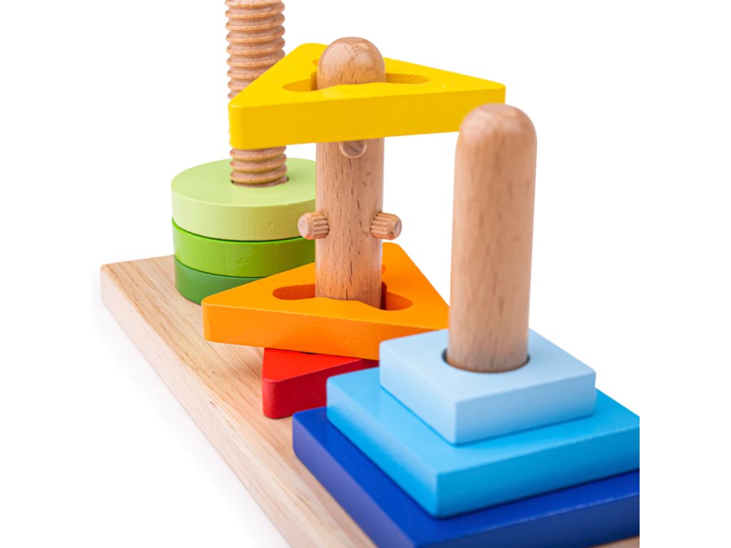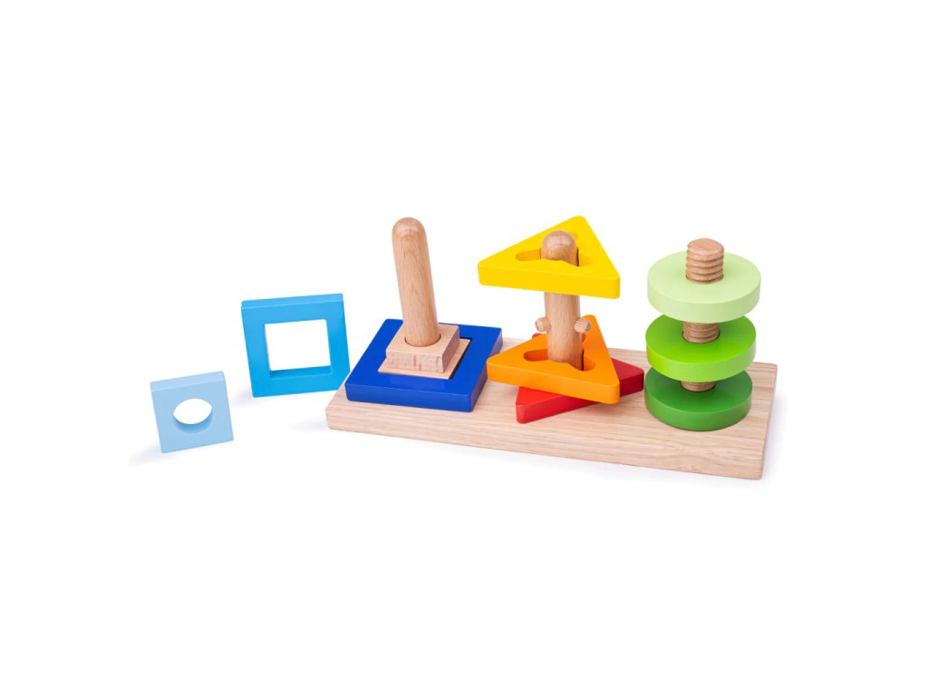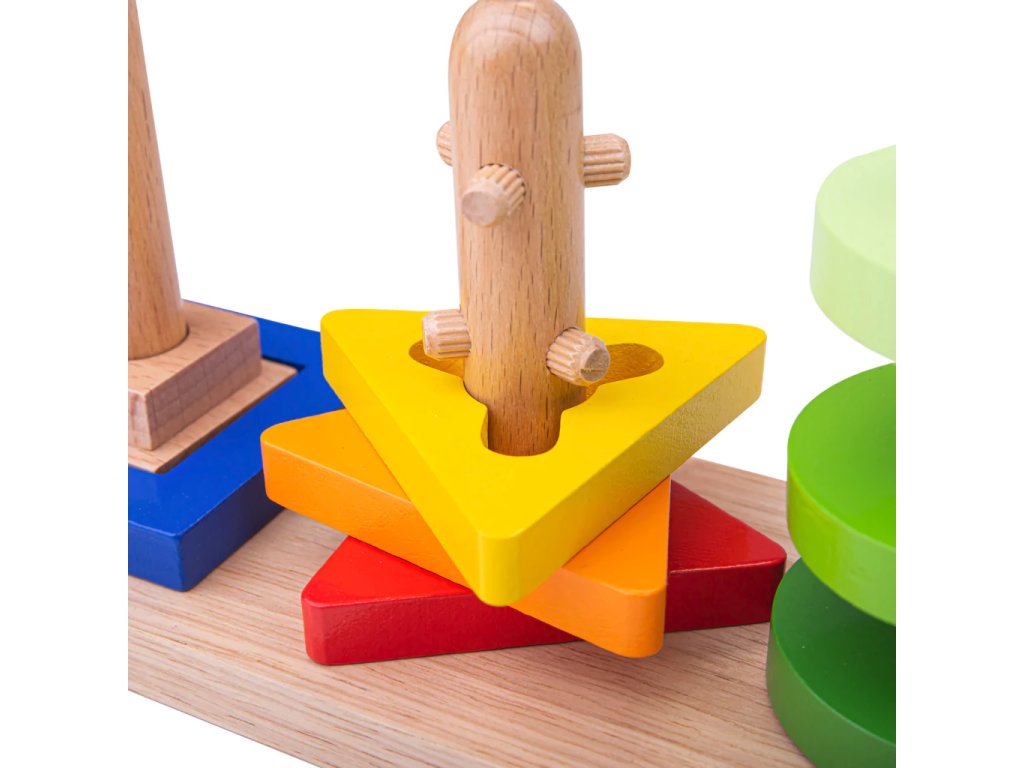 Tato vzdělávací dřevěná hračka uvádí děti do světa různých tvarů, barev a textur. Otáčejte a otáčejte každým z pestrobarevných dřevěných čtverců, trojúhelníků a kruhů a posuňte je dolů jedním ze tří pevných kolíčků, dokud nedosáhnou základny. Seřaďte je od největší po nejmenší! Hlavní vlastnosti: pomáhá rozvíjet obratnost a koncentracivyrobeno z vysoce kvalitních odpovědně získaných materiálůodpovídá současným evropským bezpečnostním normámskládá se z 9 kusů hry