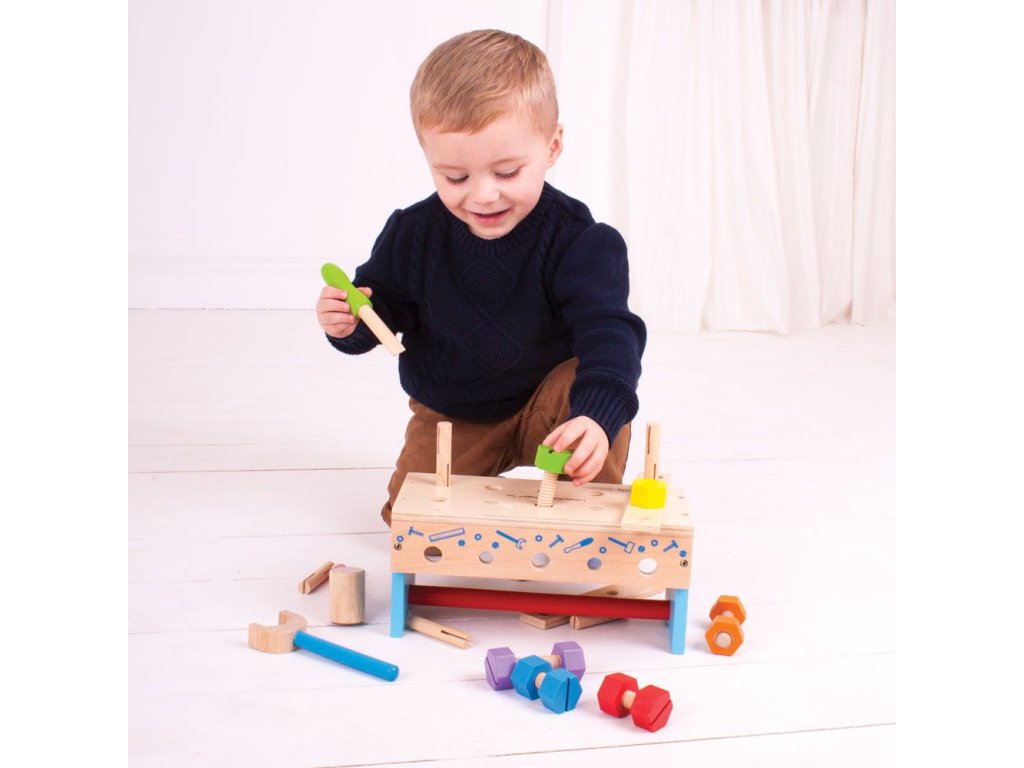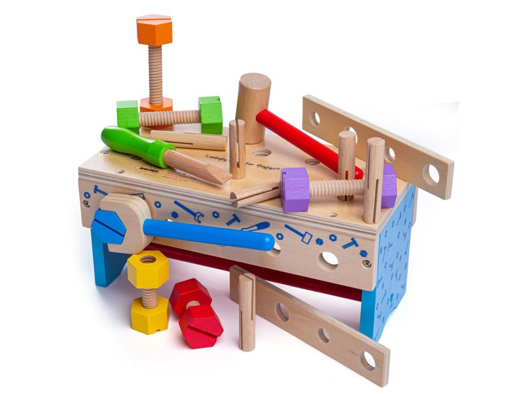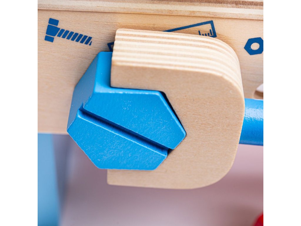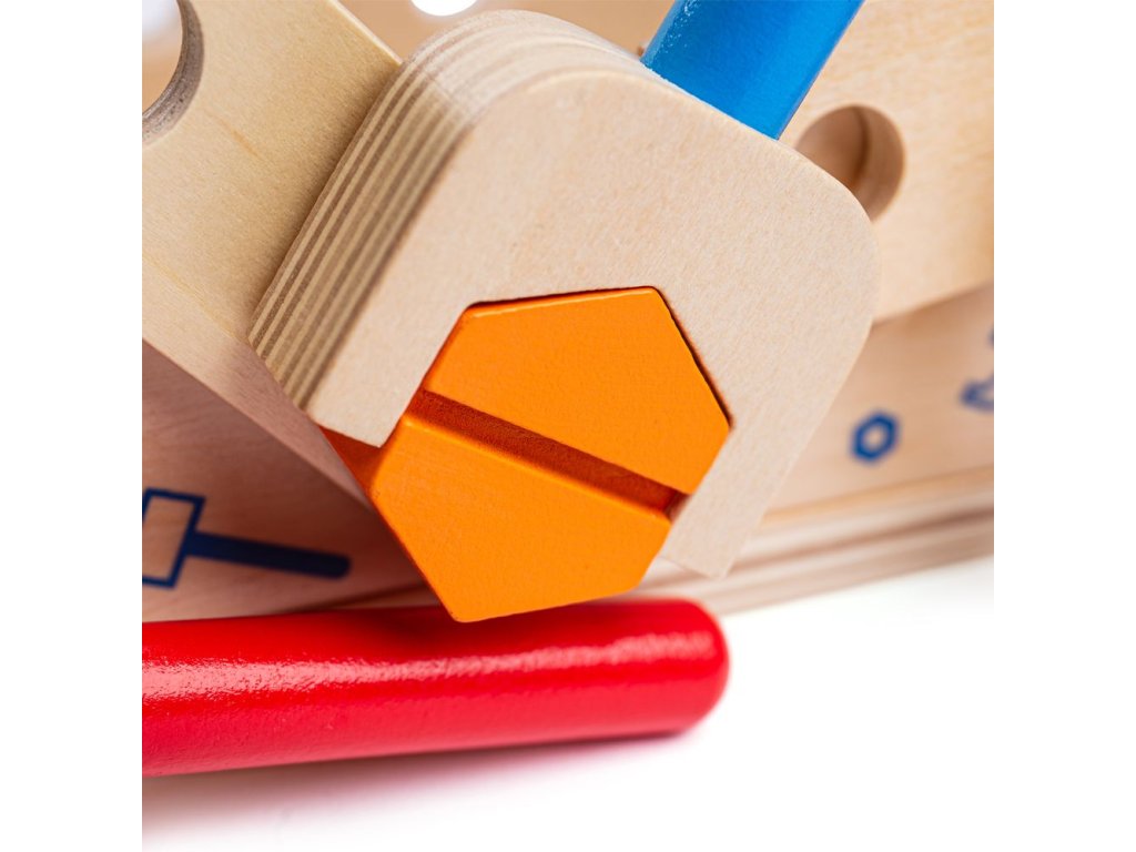 Tento chytře navržený dřevěný tesařský ponk obsahuje dřevěný klíč, kladivo a spoustu šroubů a matic. Když je čas vše uklidit, můžete ponk otočit vzhůru nohama a vše do něj uložit. Obsahuje vestavěnou rukojeť, takže dřevěná hračka může cestovat s vašimi dětmi! Skládá se z 18 hracích prvků. Hlavní vlastnosti: podporuje kreativní a nápadité hranívyrobeno z vysoce kvalitních, zodpovědně získaných materiálůsplňuje aktuální evropské bezpečnostní normy