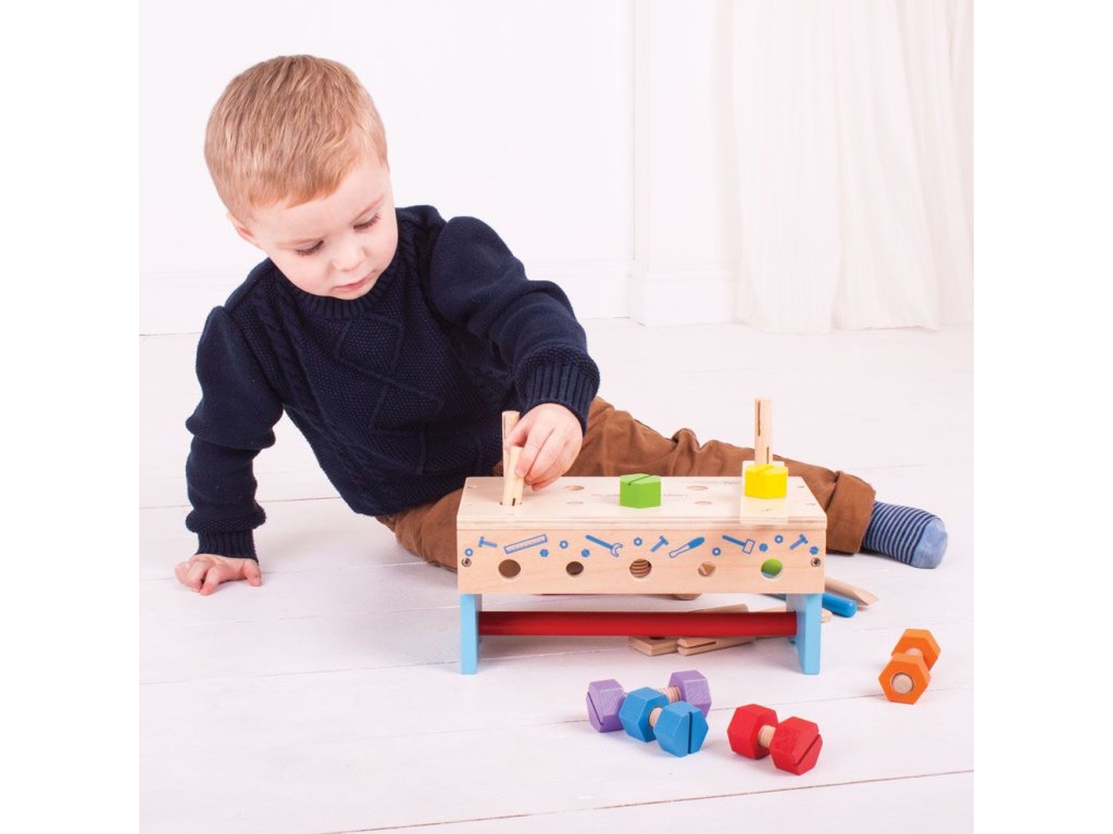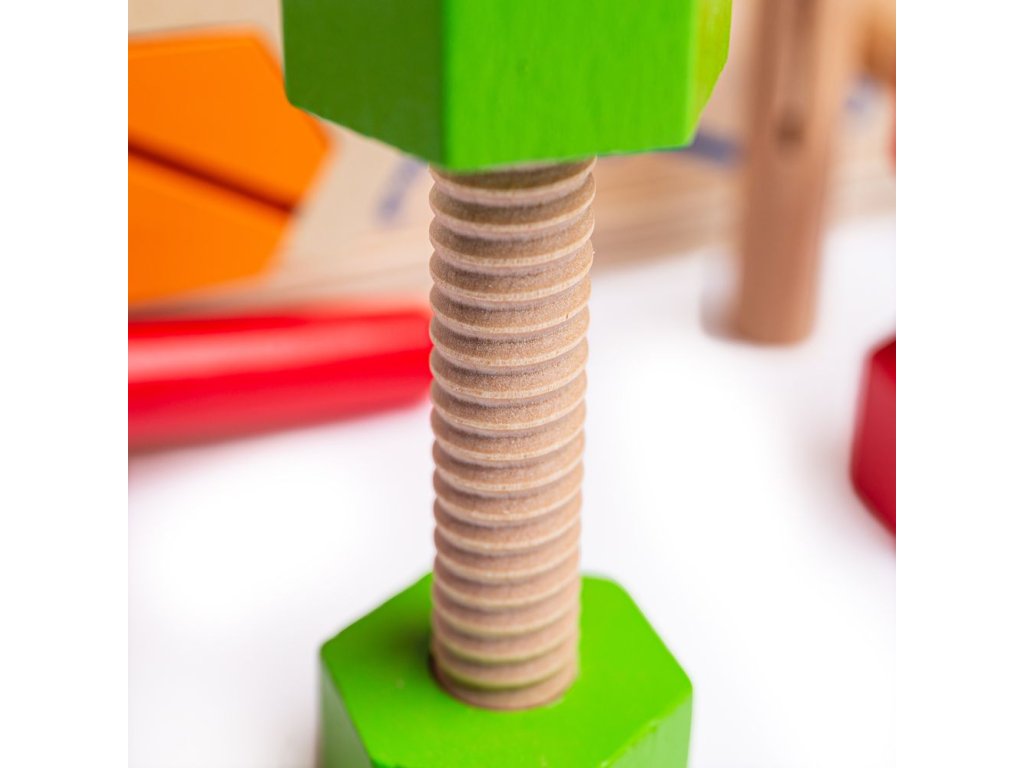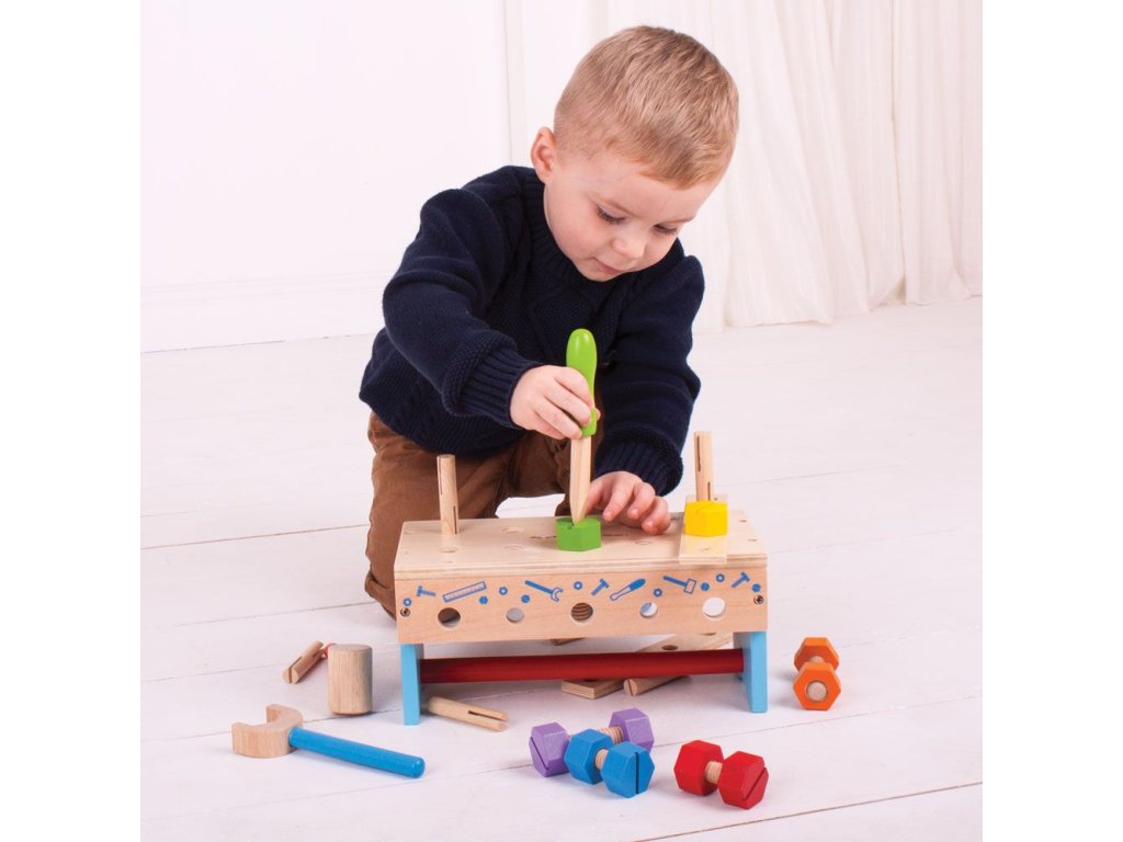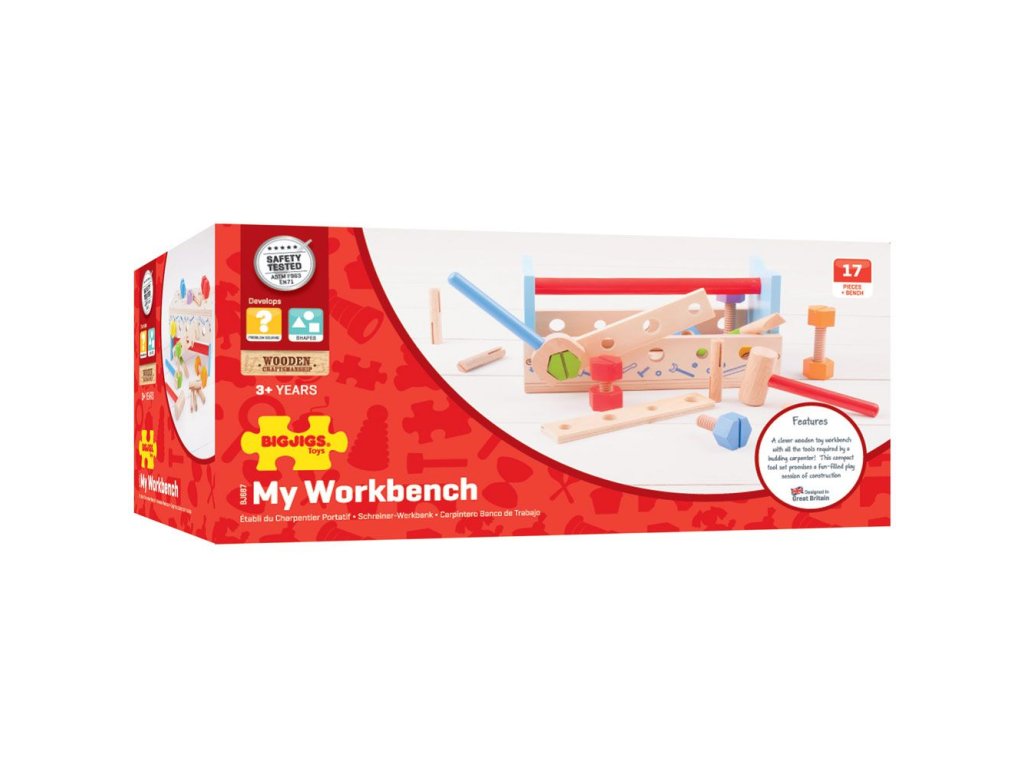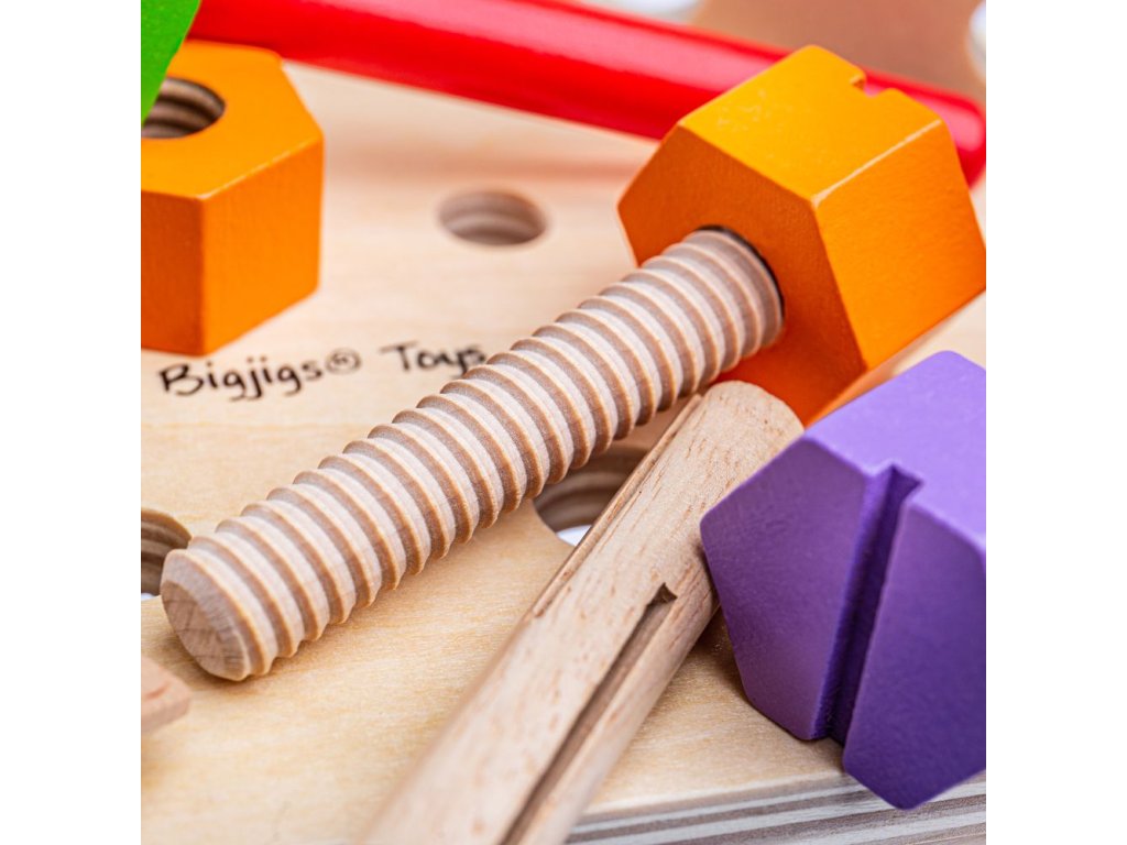Tento chytře navržený dřevěný tesařský ponk obsahuje dřevěný klíč, kladivo a spoustu šroubů a matic. Když je čas vše uklidit, můžete ponk otočit vzhůru nohama a vše do něj uložit. Obsahuje vestavěnou rukojeť, takže dřevěná hračka může cestovat s vašimi dětmi! Skládá se z 18 hracích prvků. Hlavní vlastnosti: podporuje kreativní a nápadité hranívyrobeno z vysoce kvalitních, zodpovědně získaných materiálůsplňuje aktuální evropské bezpečnostní normy