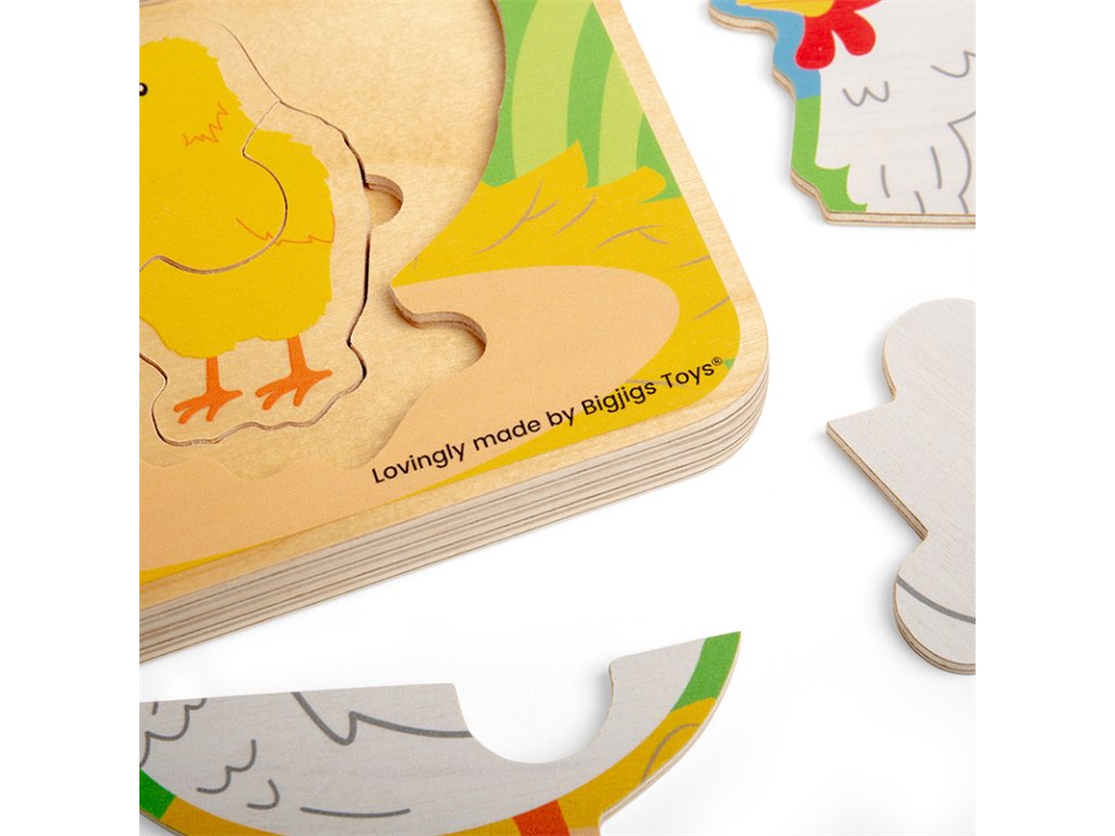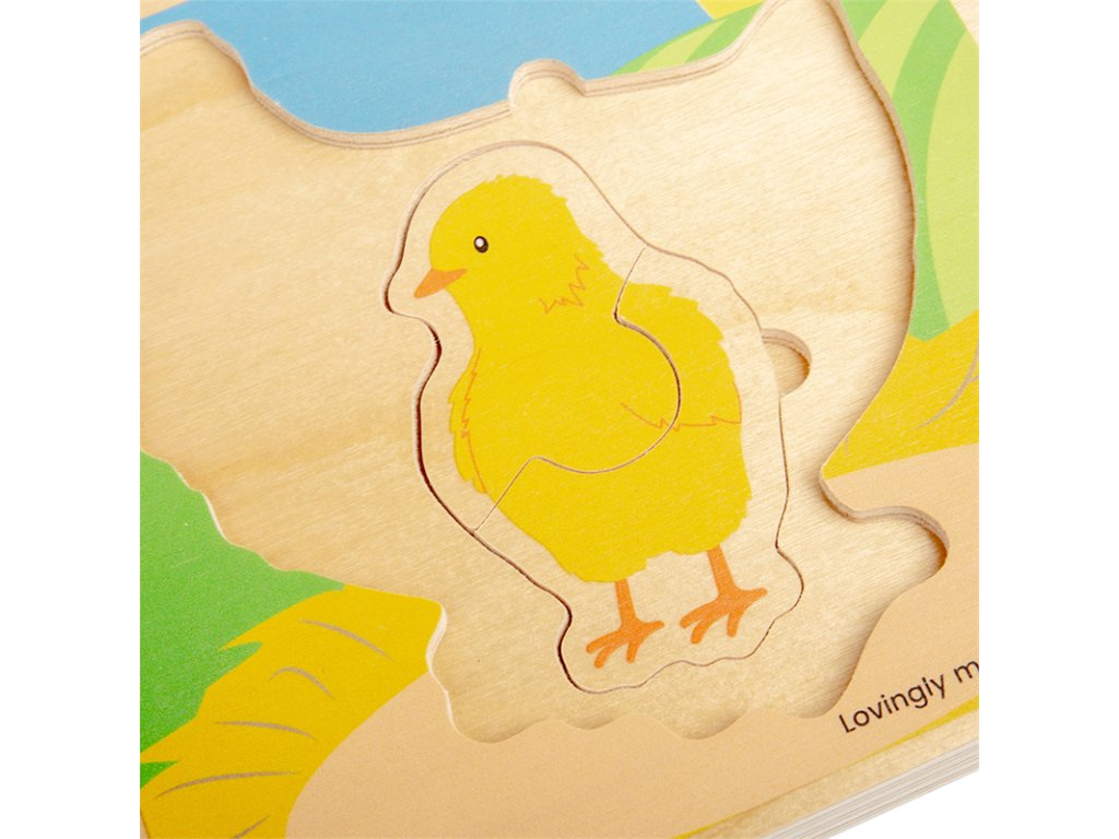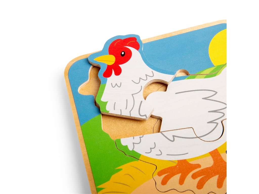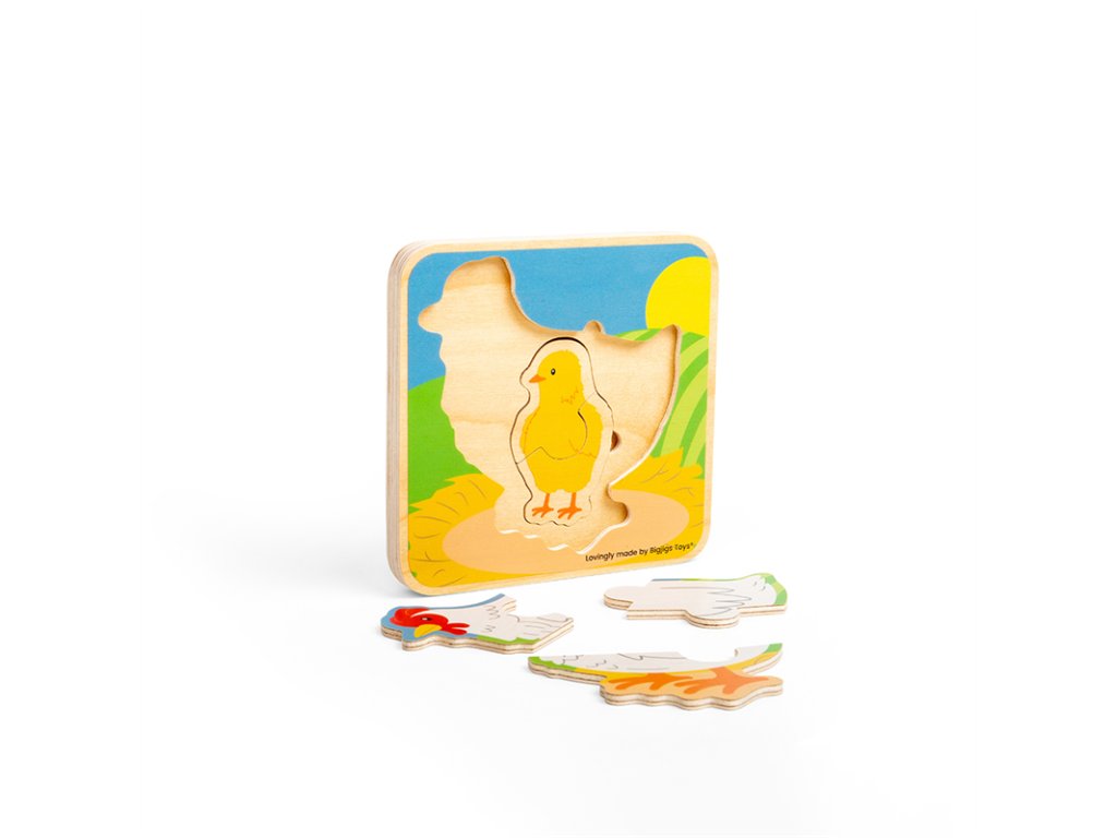 Dřevěné puzzle, které dětem ukáže životní cyklus slepice od vajíčka až po dospělost. Stačí odstranit všechny puzzle až na počátek životní etapy slepičky. Poté se postupně vkládají jednotlivé dílky dle velikosti. Objevuje kuřátko, jak roste, až do dospělosti. Děti se přitom naučí něco nového o zvířecí říši. Pomáhá rozvíjet obratnost, koordinaci oko-ruka a soustředění. Vhodné na doma i na cesty. Stavět ho můžou děti od roku a půl. Hlavni vlastnosti: vyrobeno z vysoce kvalitních, odpovědně získaných materiálůodpovídá současným evropským bezpečnostním normámkrásné barevné zpracovánívhodné od 1,5 roku