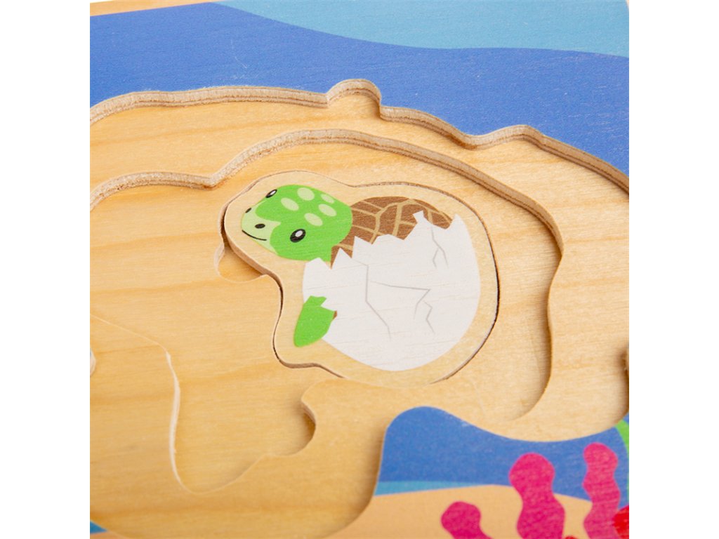 Dřevěné puzzle, které dětem ukáže životní cyklus želvy od vajíčka až do dospělosti. Stačí odstranit všechny puzzle až na počátek životní etapy želvičky. Poté se postupně vkládají jednotlivé dílky dle velikosti. Pokaždé se objevuje želvička o něco starší, až do dospělosti. Děti se přitom naučí něco nového o zvířecí říši. Pomáhá rozvíjet jemnou motoriku a soustředění. Vhodné na doma i na cesty. Stavět ho mohou děti od roku a půl. Hlavni vlastnosti: vyrobeno z vysoce kvalitních, odpovědně získaných materiálůodpovídá současným evropským bezpečnostním normámkrásné barevné zpracovánívěk: 1,5+