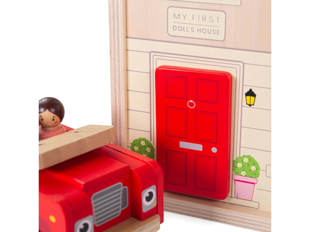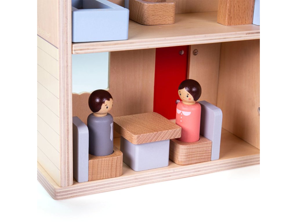Rozložením detailně zpracovaného domečku odhalíte dětem roztomilý miniaturní svět, ve kterém mohou rozehrát ty nejfantastičtější příběhy a přitom po krůčcích budovat své sociální dovednosti. V jeho třech podlažích mohou děti různě přestavovat nábytek a uvádět do rozmanitých situací dvojici figurek. Součástí soupravy je také atraktivní autíčko, se kterým mohou obyvatelům domečku připravit další nevšední zážitky. Všechny díly jsou velikostí přizpůsobeny tak, aby je děti mohly snadno uchopit. Přírodní materiál a hladká povrchová úprava zároveň pomáhají stimulovat hmat. Domeček je vybaven provazovým uchem usnadňujícím jeho přenášení a důmyslná západka přitom zabrání, aby se příslušenství uložené uvnitř vysypalo. Celá sada je vyrobena z vysoce kvalitního a zodpovědně získaného dřeva ošetřeného nezávadnými barvami i laky. Hlavní vlastnosti:rozkládací domeček, 13 dílů nábytkového vybavení, 2 figurky a autíčkosnadno přenosný a skladný díky uchu a západceodolné a atraktivní dřevěné zpracování