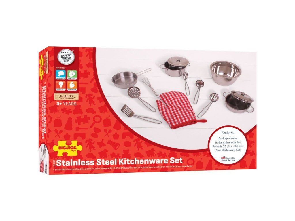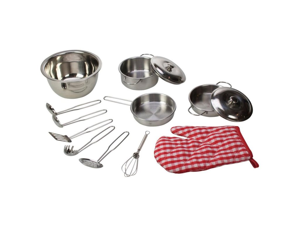 Tato profesionálně vypadající sada kuchyňského nádobí, ideální pro malé ručičky, inspiruje a potěší mladé kuchaře stejnou měrou! Kovové hrnce, pánve a naběračky jsou dodávány s praktickou chňapkou. Skvělý způsob, jak vzdělávat nejmenší o každém kroku přípravy, tvoření a vaření v kuchyni! Podporuje kreativní a nápadité hraní rolí. Splňuje aktuální evropské bezpečnostní normy. Skládá se ze 13 hracích prvků. Hlavní vlastnosti: obsahuje 13 dílůpodporuje kreativitu a nápaditostrozvíjí sociální dovednostizlepšuje obratnost a motoriku