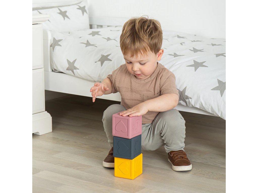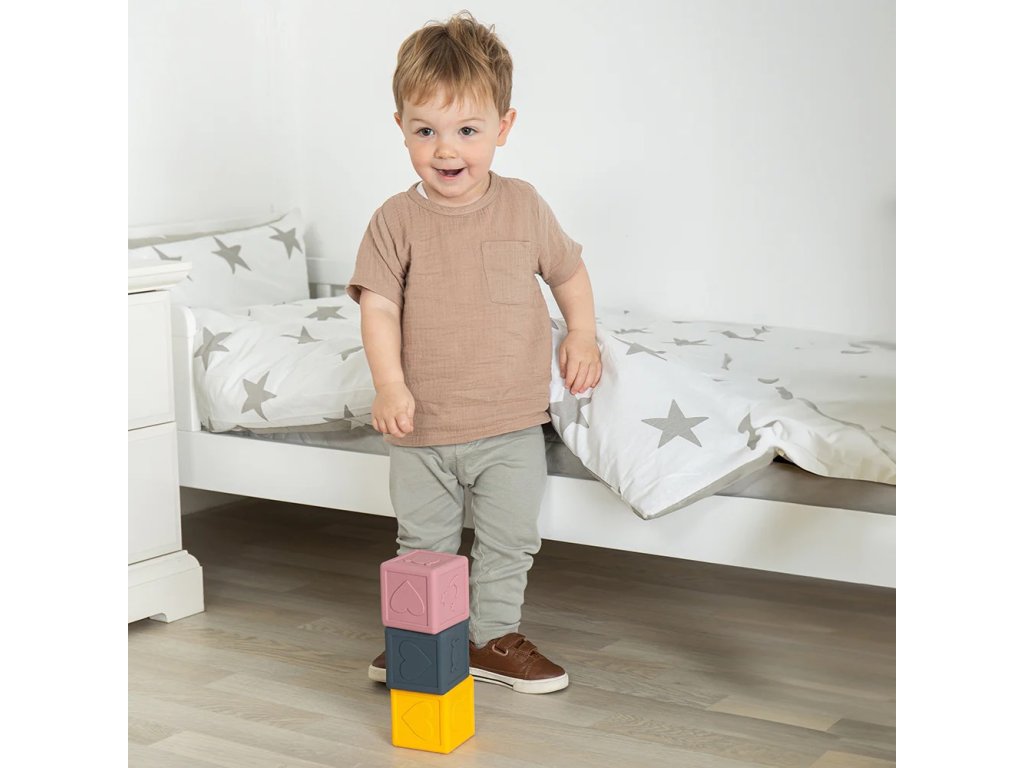 Hmatání, kousání, skládání a padání! Tyto senzorické kostky jsou vyrobeny z hladkého silikonu, v balení najdete tři, z nichž má každá jiné vzory, např. králíček, slunce, měsíc, hvězdy… Tyto senzorické kostky děti uvedou do světa skládacích hraček, procvičí si s nimi úchop a uvolnění ruky, zručnost, koordinaci ruka-oko. Hračka má neutrální barvy a mimo hru také poslouží jako dekorace dětského pokojíku. Vyrobeno ze 100% potravinářského silikonu, malováno netoxickými barvami a laky. Odpovídá evropským bezpečnostním standardům. Hlavní vlastnosti: sada 3 kostekvhodné pro rozvoj smyslůvyrobeno ze 100% potravinářského silikonuvhodné od 3 měsíců