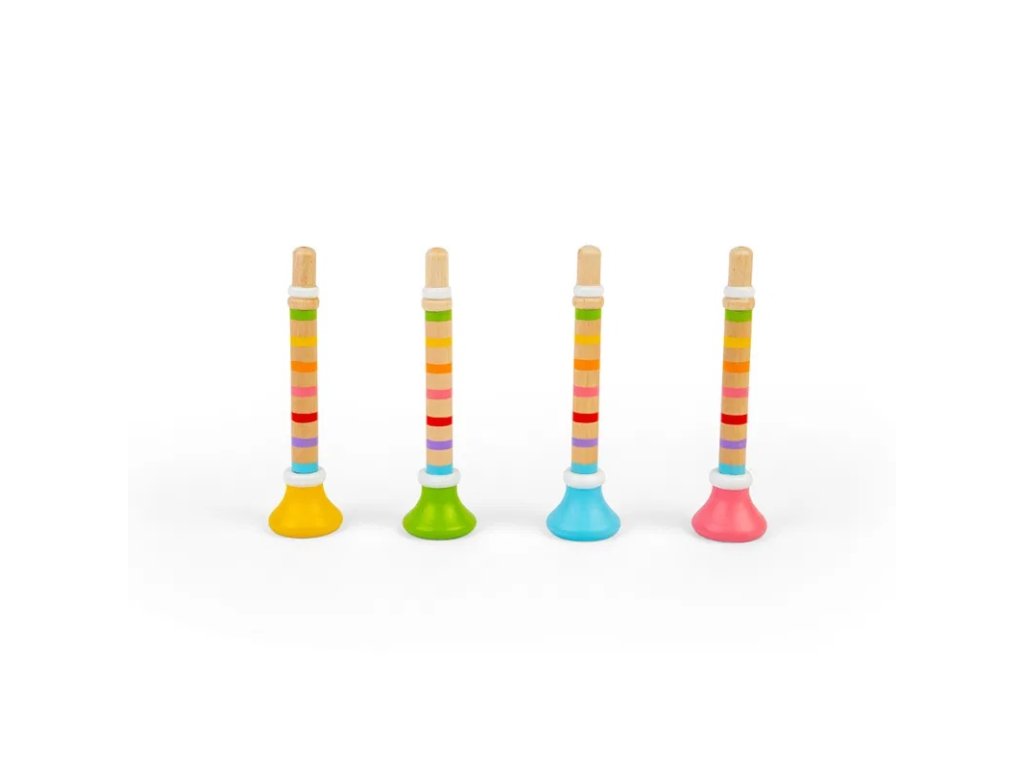 Cena je uvedena za 1 ks. Tyto roztomilé trumpetky v pruhovaném duhovém designu děti jistě potěší. Budou se učit rytmu a časování, vytvoří si vlastní skladbu. Trumpetky mají velikost tak akorát pro dětské ruce. Jsou ideální k úvodu do světa zvuku a rytmu, podpoří děti v kreativitě. Vyrobeno z kvalitních materiálů z odpovědných zdrojů. Splňuje všechny aktuální evropské bezpečnostní normy. Hlavní vlastnosti: rozvíjí zručnosthravý úvod do světa zvuku a rytmuvyrobeno ze dřeva