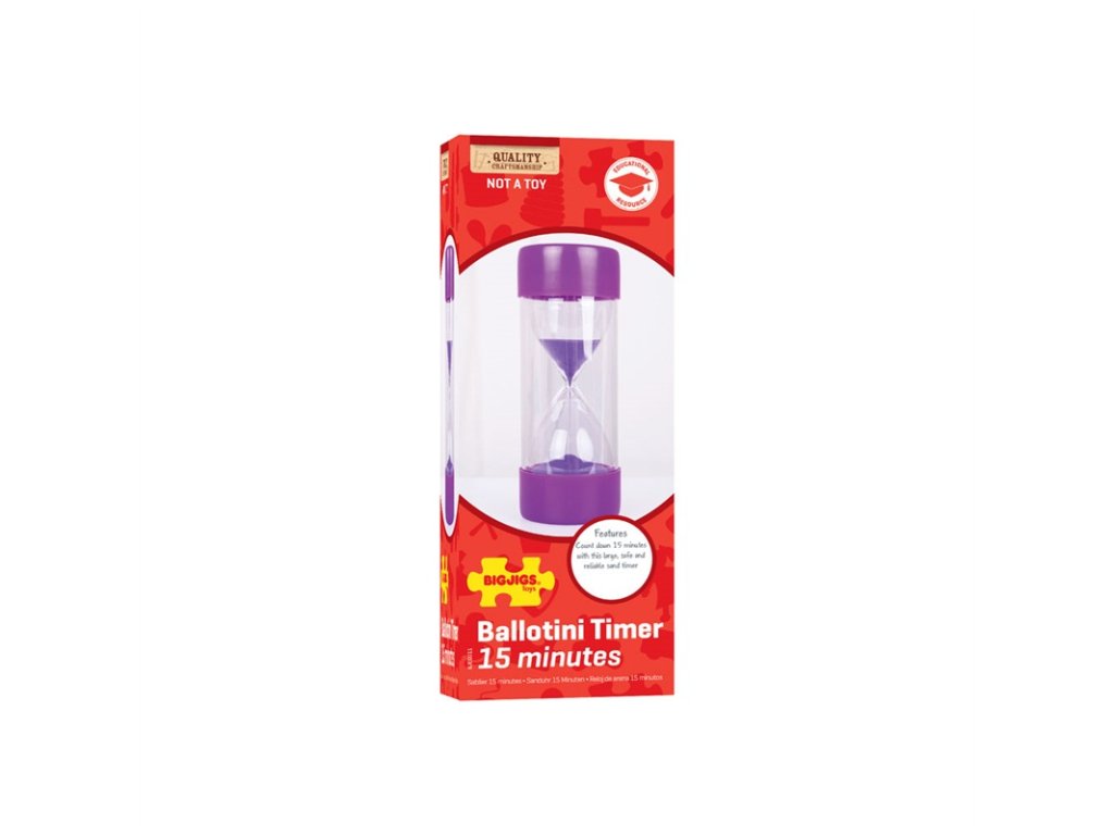 Nejedná se o přesné určení času na sekundy, může dojít k odchylce... Bigjigs Toys přesýpací hodiny jsou ideální pomůckou pro pochopení plynutí času efektivní vizualizací. Nezničitelný design dělá z tohoto výrobku vynikající pomůcku pro všechny věkové kategorie. Přesýpací hodiny jsou ideální pro použití doma nebo ve škole jako určení doby jakékoliv činnosti např. dobu učení, úklidu apod. Vnitřní nádobka na písek je vyrobena ze skla, vnější obal je z pevného ochranného plastu. Odpovídá současným evropským bezpečnostním normám. Hlavní vlastnosti: odměřuje 15 minutpochopení plynutí času efektivní vizualizacípraktické využití u mnoha činností
