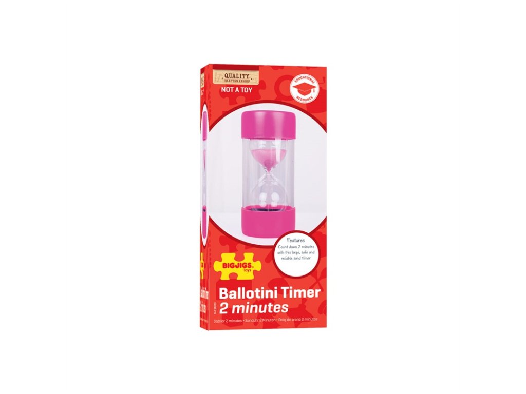 Nejedná se o přesné určení času na sekundy, může dojít k odchylce... Bigjigs Toys přesýpací hodiny jsou ideální pomůckou pro pochopení plynutí času efektivní vizualizací. Nezničitelný design dělá z tohoto výrobku vynikající pomůcku pro všechny věkové kategorie. Přesýpací hodiny jsou ideální pro použití doma nebo ve škole jako určení doby jakékoliv činnosti např. dobu učení, úklidu apod. Vnitřní nádobka na písek je vyrobena ze skla, vnější obal je z pevného ochranného plastu. Odpovídá současným evropským bezpečnostním normám. Hlavní vlastnosti: odměřuje 2 minutypochopení plynutí času efektivní vizualizacípraktické využití u mnoha činností