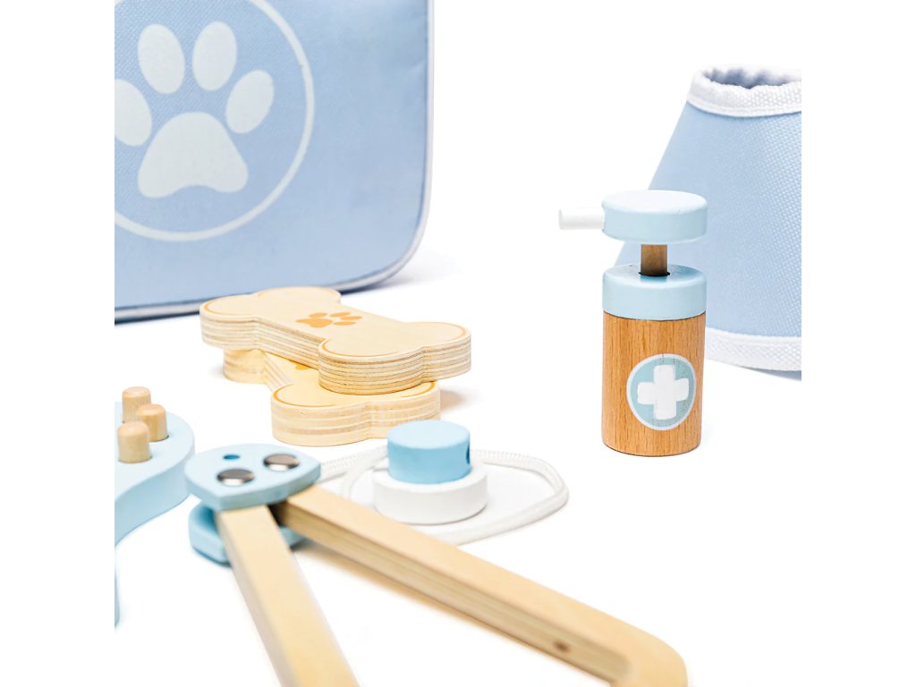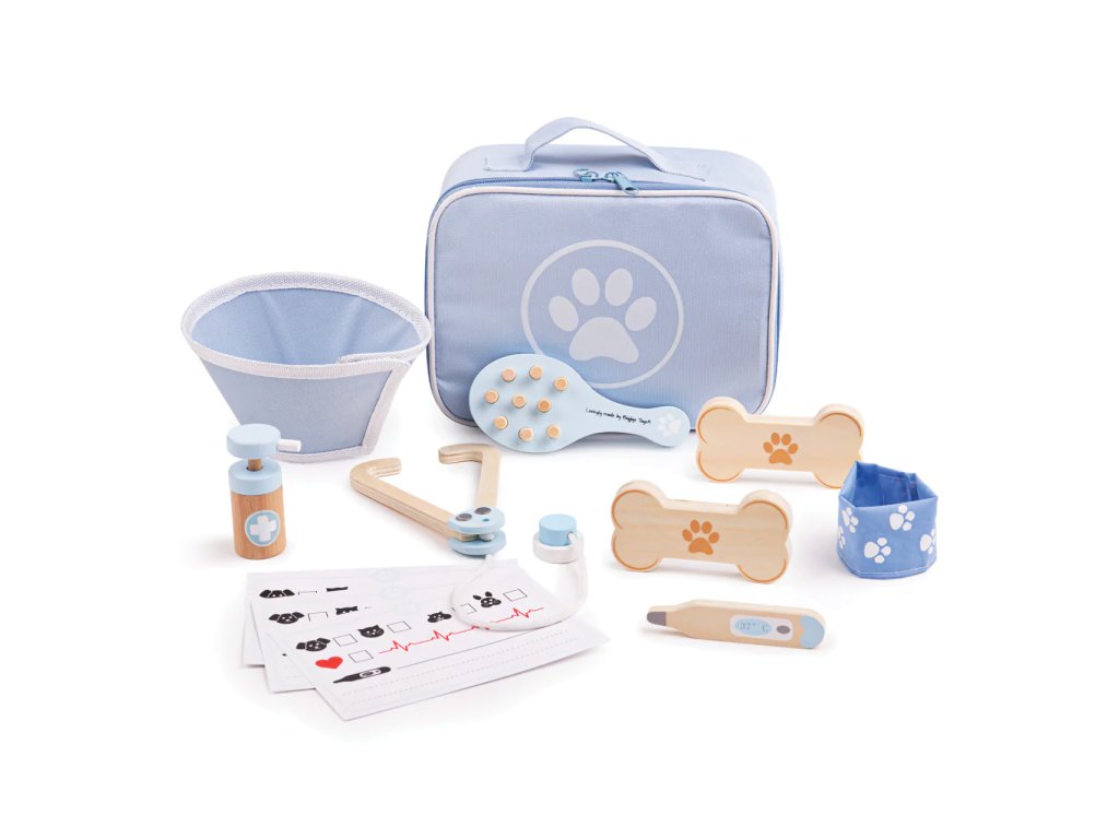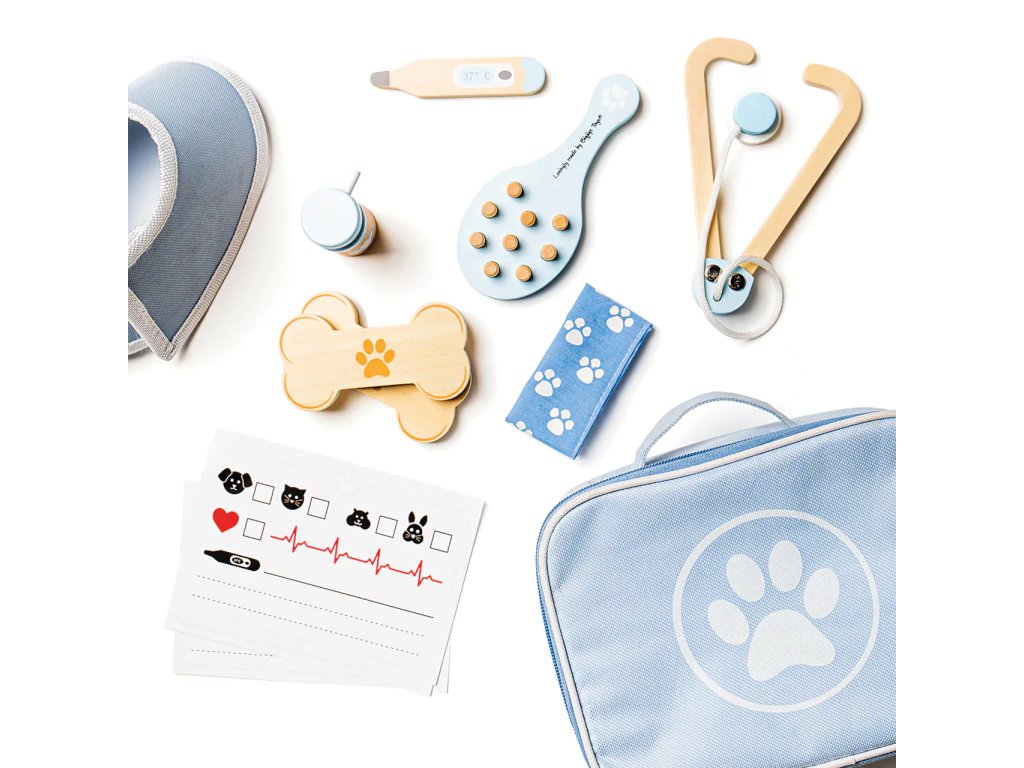 Tato praktická veterinární sada obsahuje vše, co mladí veterináři potřebují, aby mohli ošetřit nemocné medvídky nebo zvířata. Pomocí stetoskopu mohou děti poslouchat srdce pacienta, kontrolovat teplotu pomocí teploměru a dokonce se podívat do uší otoskopem. Tato hrací sada je dodávána zcela bez plastů ve snadno skladovatelné brašně. Hlavní vlastnosti: obsahuje 12 dílůpraktická brašna pro ukládánírozvíjí komunikační schopnosti a prohlubuje lásku ke zvířátkům