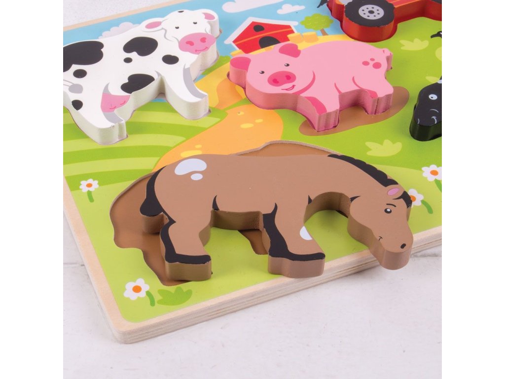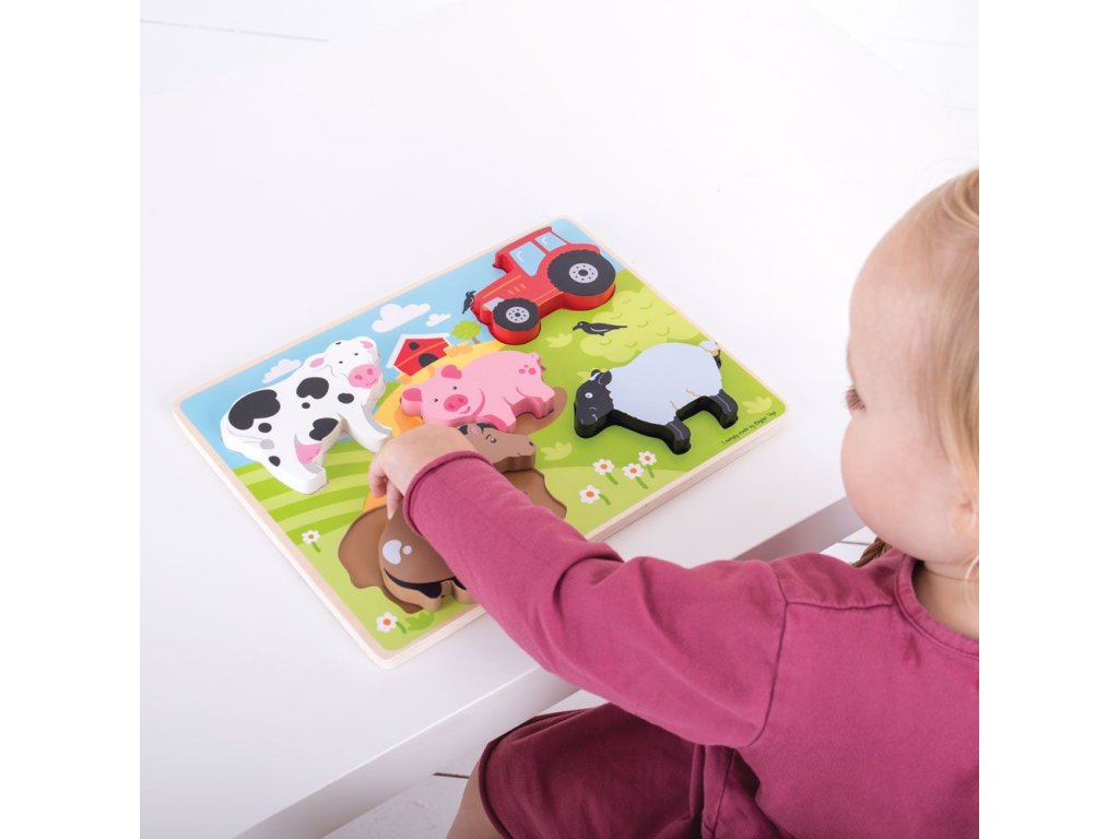 Toto dřevěné puzzle představuje veselou scénu na dvoře farmy s krávou, prasetem, ovcí, koněm a traktorem. Malé děti musí sladit každý z pestrobarevných dřevěných dílků se správně tvarovaným otvorem na základní desce. Každý kus dřevěné skládačky je ideální svou velikostí, aby jej malé ručičky snáze zvedaly, uchopovaly, zkoumaly a vyměňovaly. Skvělý způsob, jak podpořit zručnost, manipulaci, jazyk, dovednost shody, rozpoznávání tvarů a trpělivost. Dřevěné základní desky skládaček Bigjigs Toys jsou potištěny obrázky nebo barvami, aby napomáhaly procesu učení a přidávaly vzdělávací hodnotu. 5 dílků skládačky. Hlavní vlastnosti: ideální pro úchop malýma rukamapodporuje obratnost a dovednostnapomáhá učení tvarů a trpělivostiobsahuje 5 dílků
