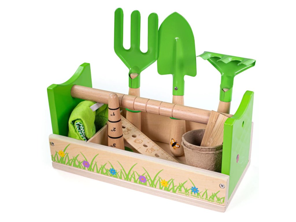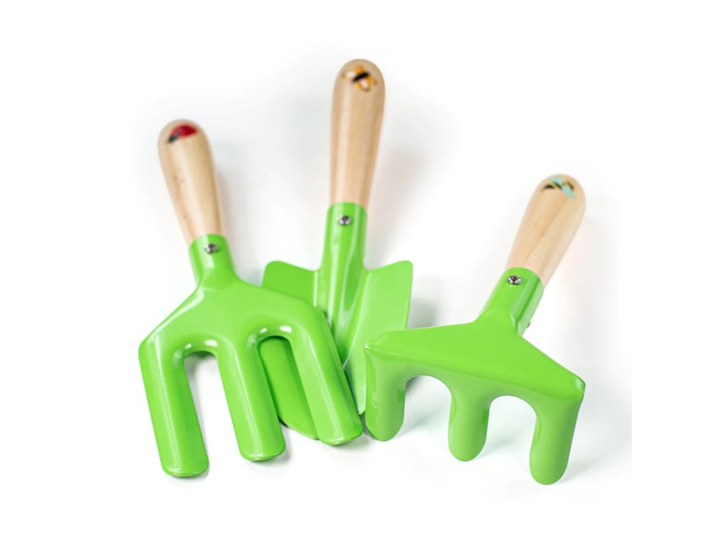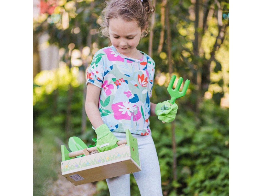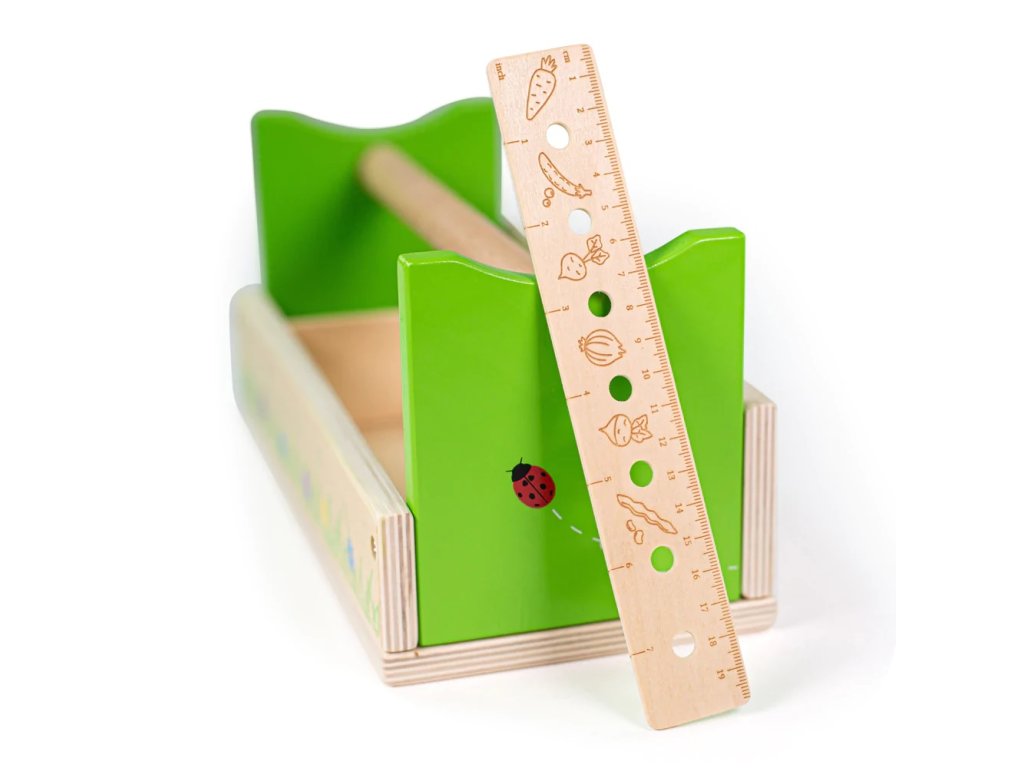 Nářadí vždy při ruce všem malým zahradníkům a zahradnicím. S touto soupravou si děti na zahradě užijí spoustu zábavy. Mohou přitom objevovat přírodní koloběh a pomoci s prací rodičům. Sada je vyrobená z vysoce kvalitního dřeva. Je zdobený pestrou zelenou barvou s designem berušek a květinek. Dodává se s celkem 11 hracími díly, včetně zahradnických rukavic, pravítka, sázecího kolíku a mnoha dalších. Nářadí je speciálně navrženo pro malé ručičky. Rukojeti jsou vyrobeny z hladkého dřeva, které je vyrobeno z vysoce kvalitních, odpovědně získaných materiálů a snadno se uchopují. Splňuje aktuální evropské bezpečnostní normy. Hlavní vlastnosti: ideální velikost pro děti vyrobeno z kovu, dřevěná násada odolné provedení