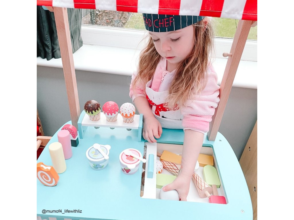Naservírujte nějakou lahodnou zmrzlinu přátelům a rodině... Tento kvalitní dřevěný vozík na zmrzlinu je dodáván s 6 zmrzlinami, 9 nanuky, 2 zmrzlinovými kelímky se lžičkami a naběračkou na zmrzlinu. Tyto sladké pochoutky jsou dokonalým doplňkem na hraní. Skvělý způsob, jak podpořit kreativní a nápadité hraní rolí. Vyrobeno z vysoce kvalitních, zodpovědně získaných materiálů. Splňuje aktuální evropské bezpečnostní normy. Hlavní vlastnosti: dřevěný vozík na zmrzlinukompletní s 6 zmrzlinami, 9 nanuky, 2 kelímky na zmrzlinu se lžičkami a naběračkou na zmrzlinupomáhá rozvíjet slovní zásobu při prodeji a servírování zmrzliny svým přátelům