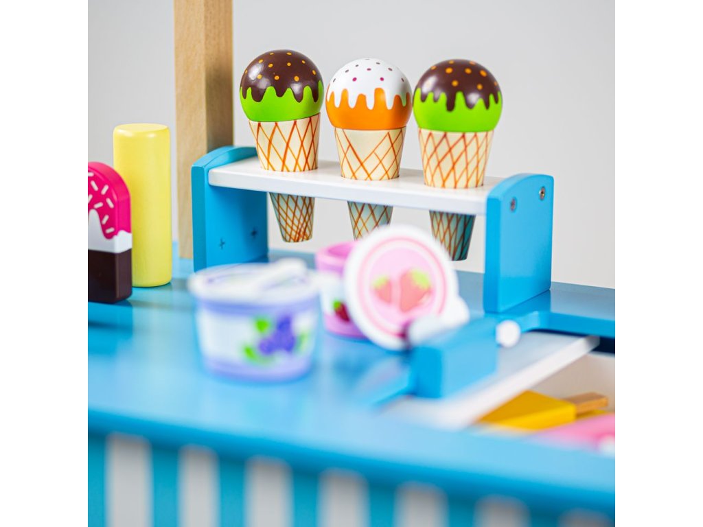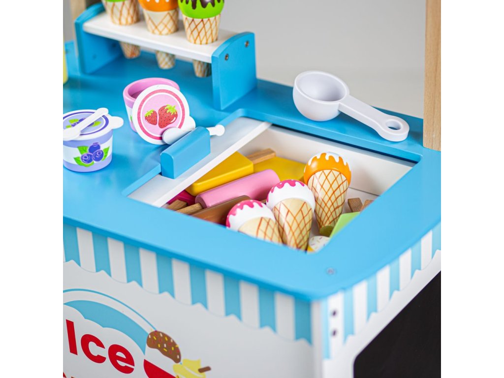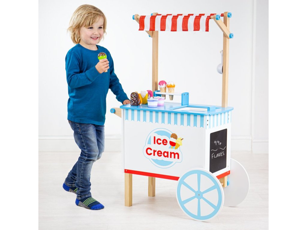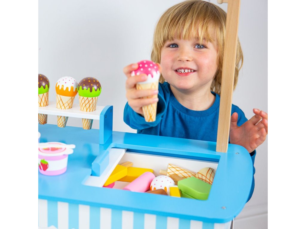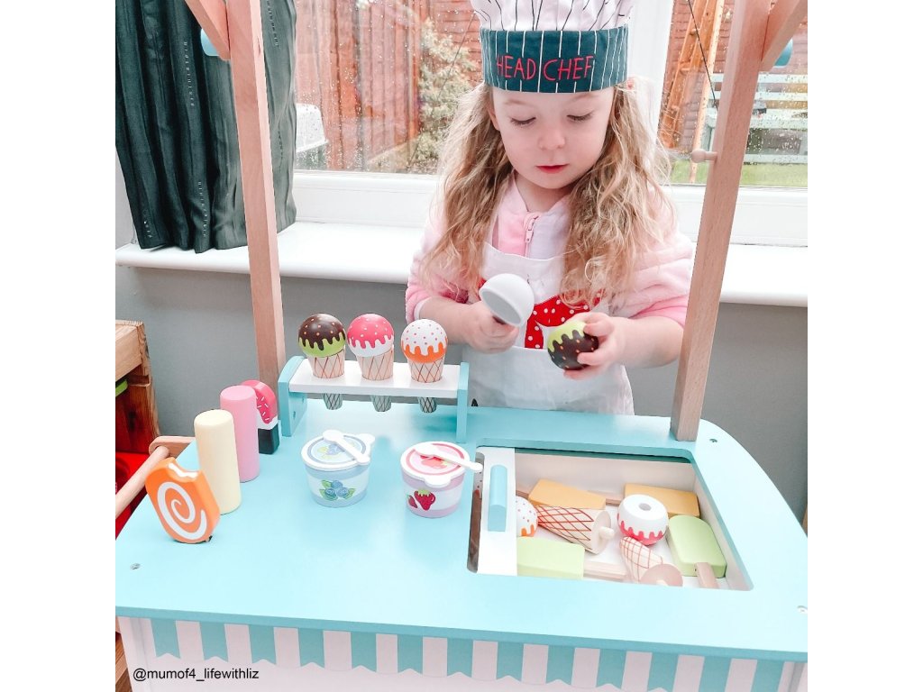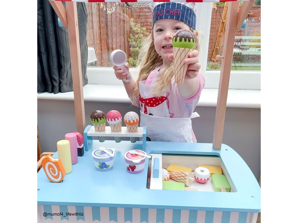 Naservírujte nějakou lahodnou zmrzlinu přátelům a rodině... Tento kvalitní dřevěný vozík na zmrzlinu je dodáván s 6 zmrzlinami, 9 nanuky, 2 zmrzlinovými kelímky se lžičkami a naběračkou na zmrzlinu. Tyto sladké pochoutky jsou dokonalým doplňkem na hraní. Skvělý způsob, jak podpořit kreativní a nápadité hraní rolí. Vyrobeno z vysoce kvalitních, zodpovědně získaných materiálů. Splňuje aktuální evropské bezpečnostní normy. Hlavní vlastnosti: dřevěný vozík na zmrzlinukompletní s 6 zmrzlinami, 9 nanuky, 2 kelímky na zmrzlinu se lžičkami a naběračkou na zmrzlinupomáhá rozvíjet slovní zásobu při prodeji a servírování zmrzliny svým přátelům